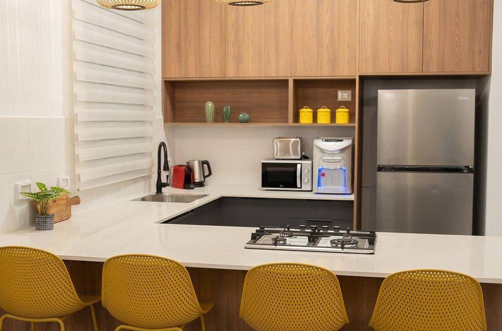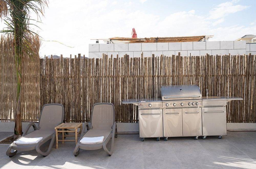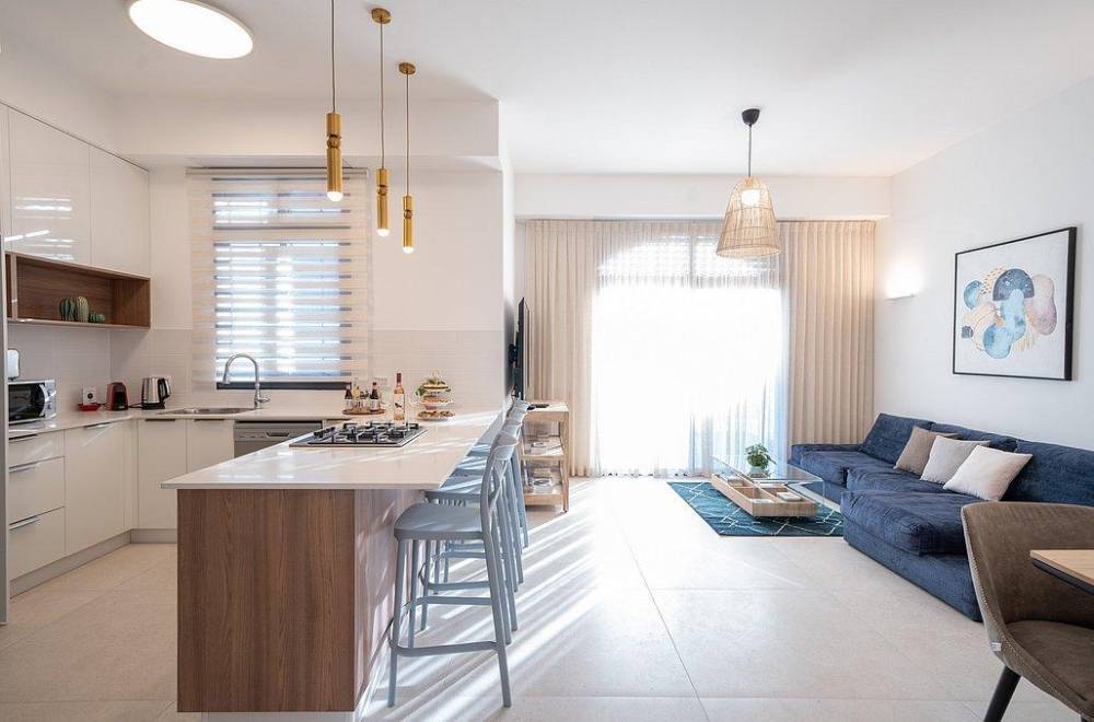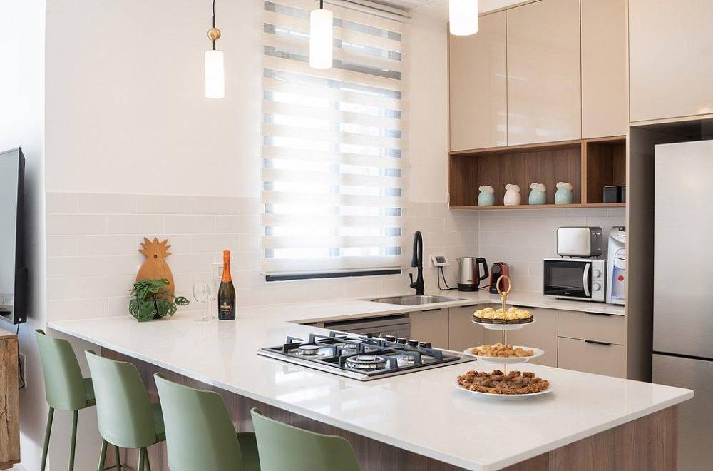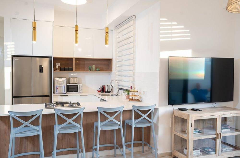 מטבח מאובזר (מקרר, תמי4, מכונת אספרסו, מדיח כלים, כיריים גז, תנור אפייה, קומקום חשמלי, מיקרוגל, טוסטר, כלי אוכל והגשה).