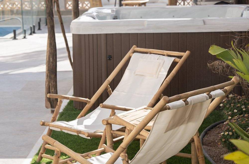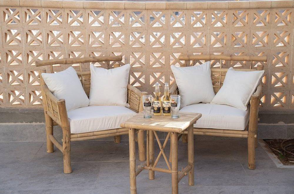 חצר מרווחת עם פינות ישיבה ומיטות שיזוף
