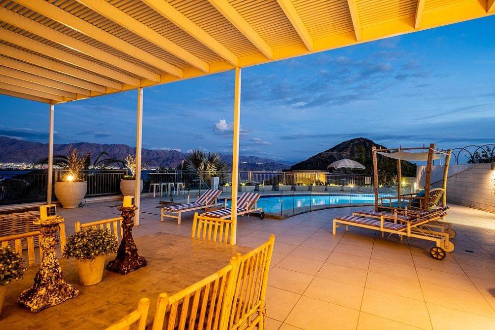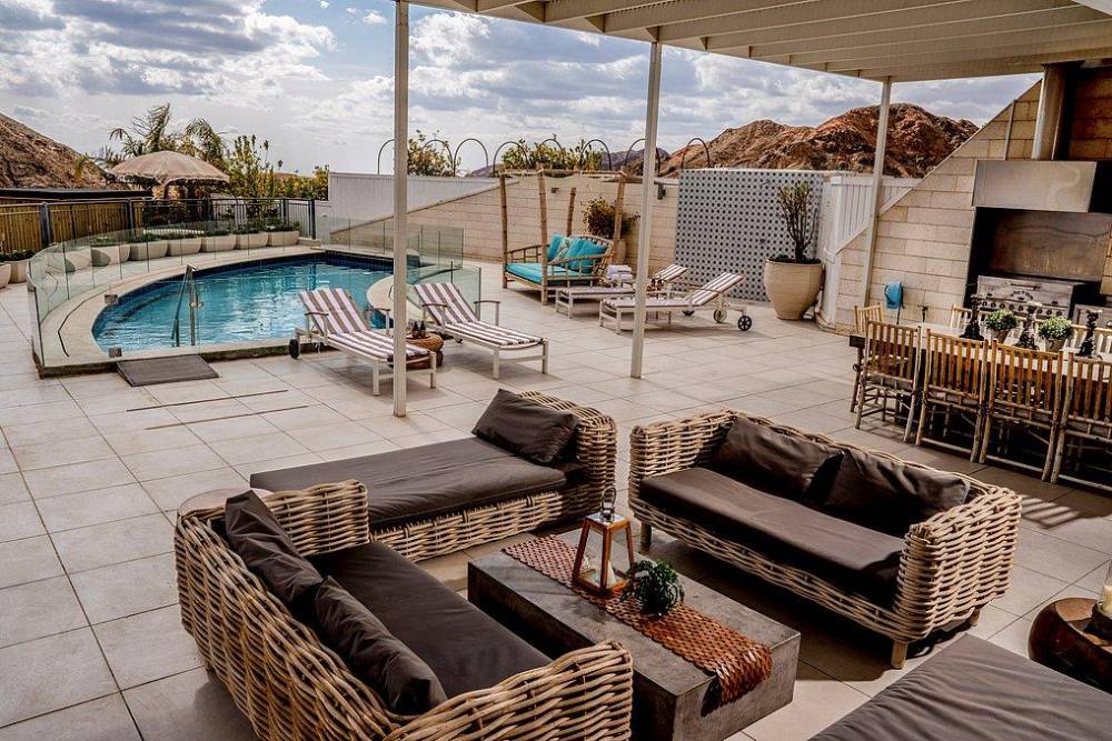 סלון חוץ מרווח ומפנק, מיטות שיזוף ופינות ישיבה פזורות בחצר הבית