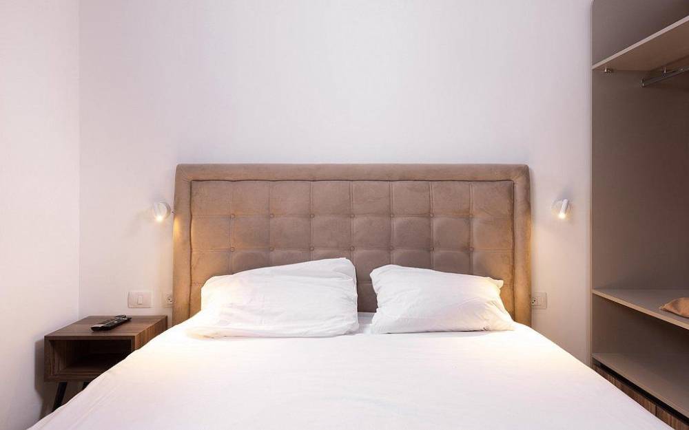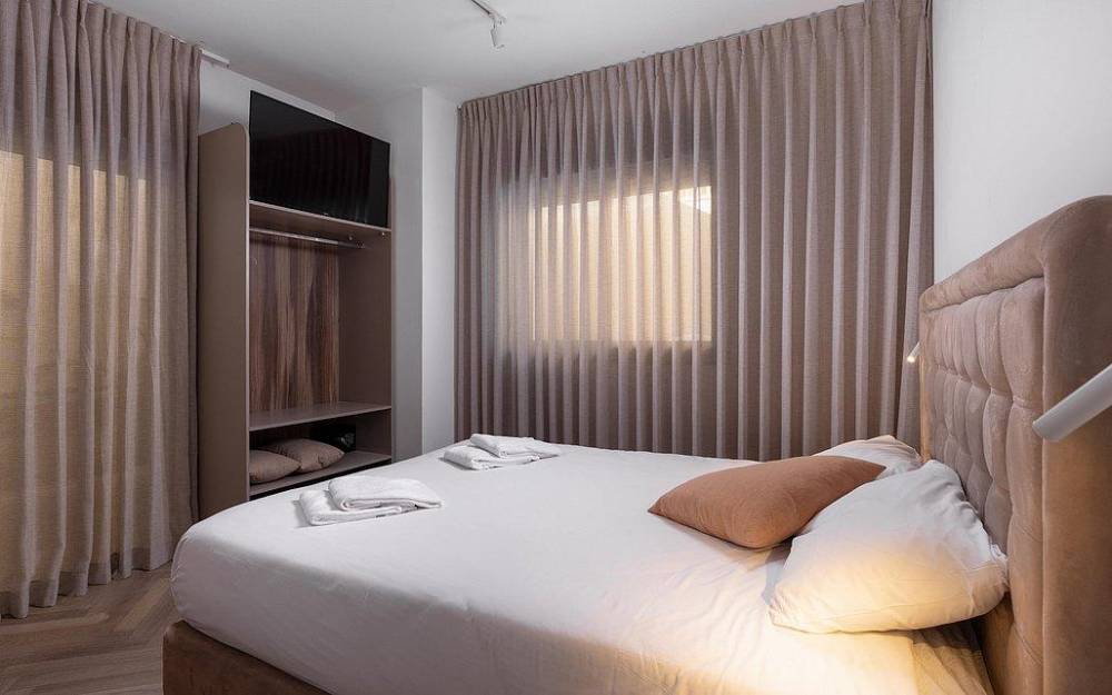 מיטה זוגית, מיזוג אוויר, טלוויזיה, שידות/ארון לאחסון ותאורת לילה.