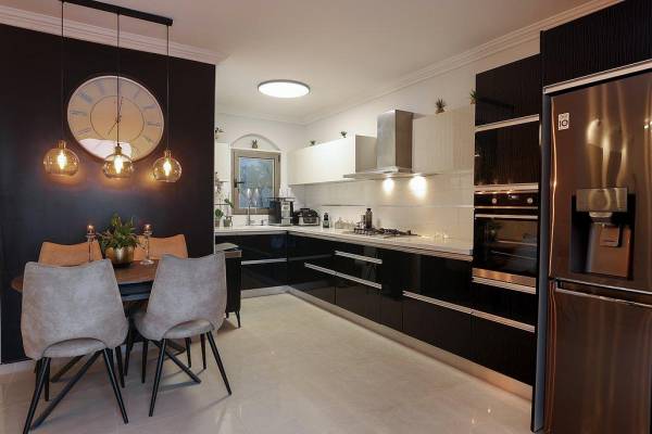 פינת אוכל גדולה עם אופציה להוספת שולחן מתקפל וכסאות.