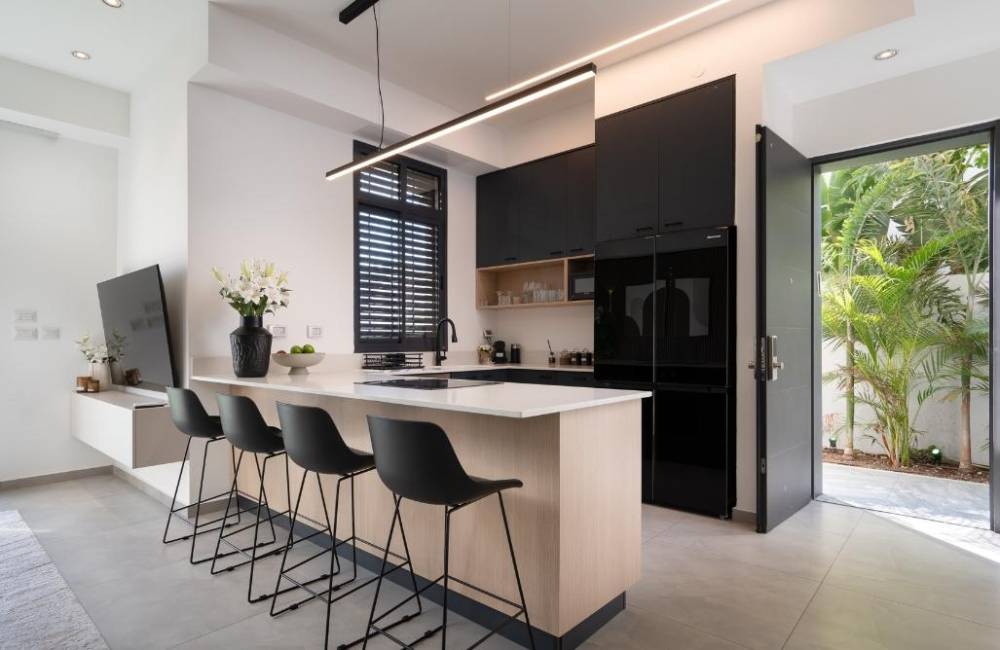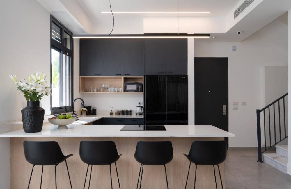 מטבח מאובזר קומפלט הכולל אי ומכיל: מקרר, מקפיא, תנור אפיה, מכונת אספרסו,כיריים חשמליות, קומקום חשמלי, מיקרוגל, כלי אוכל והגשה.