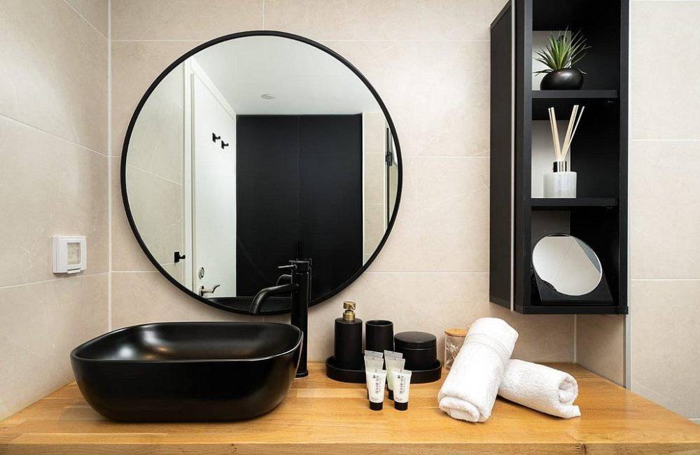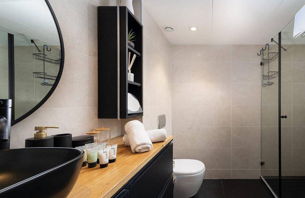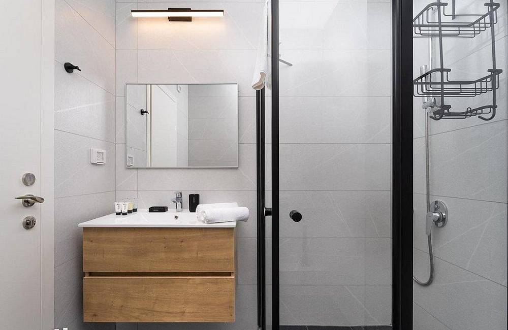 - חדר רחצה מודרני עם מקלחון, מגבות ומוצרי טואלטיקה