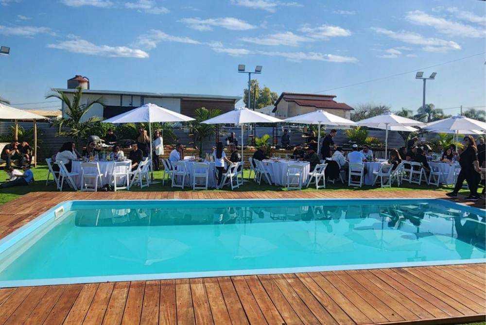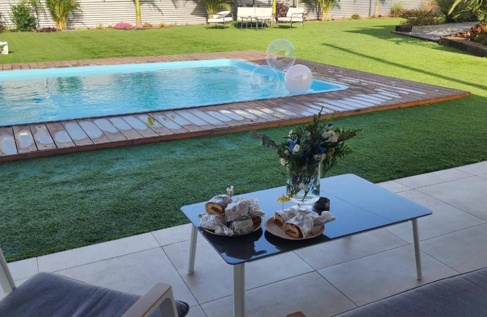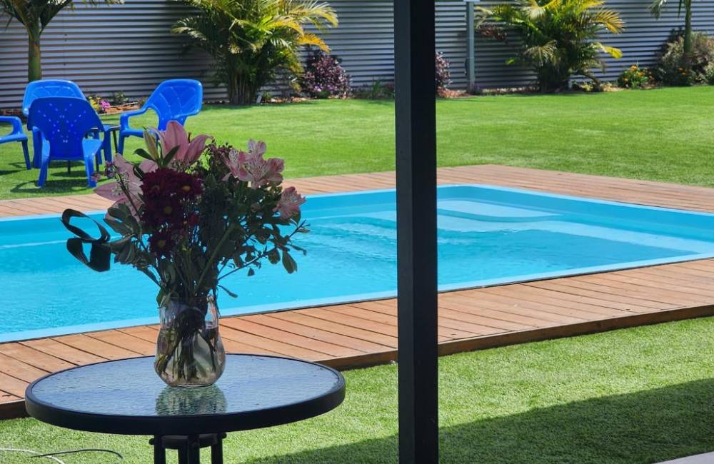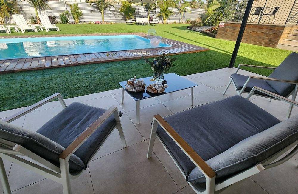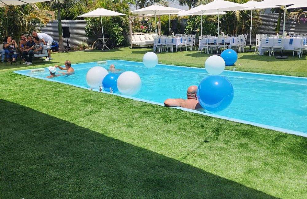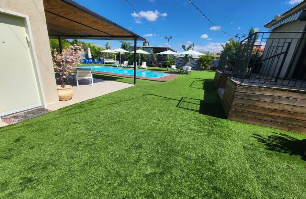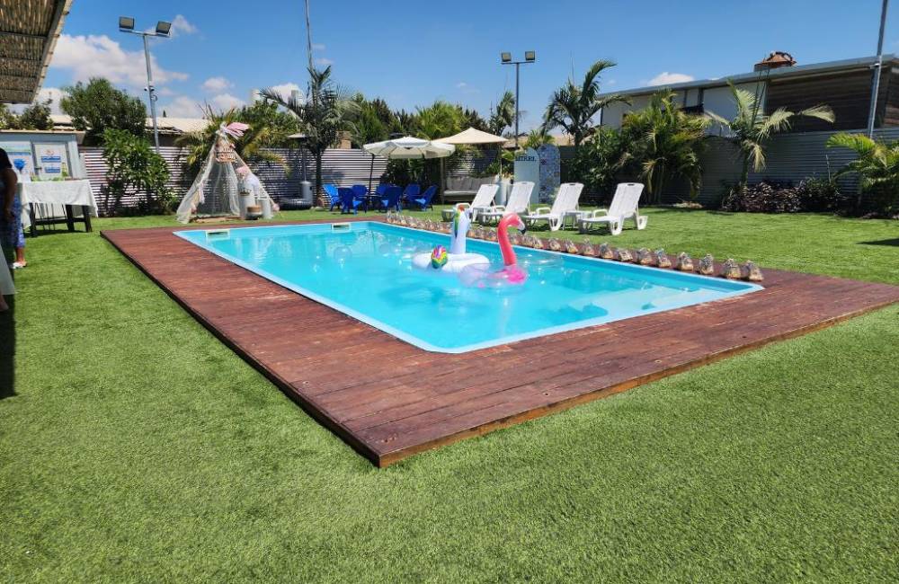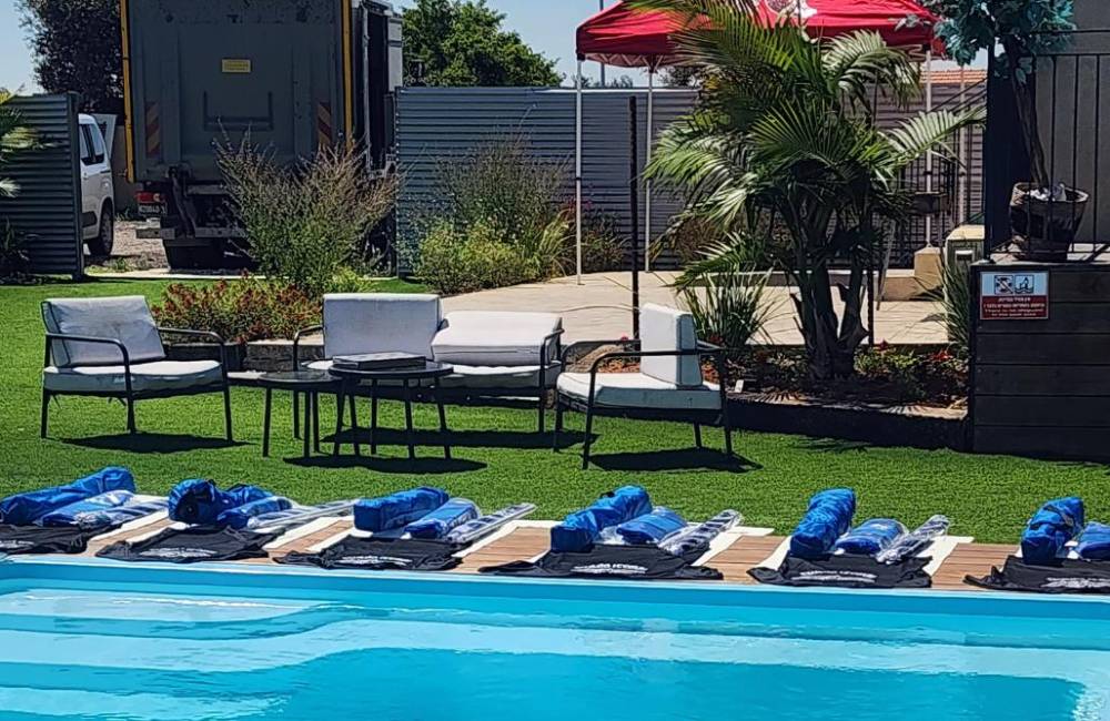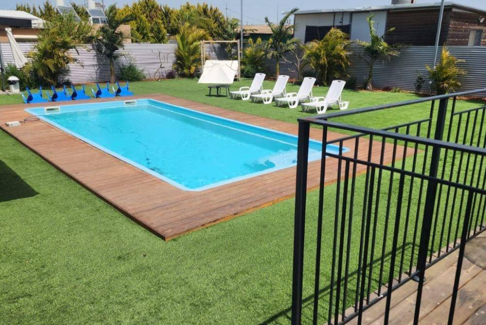בריכת שחייה גדולה ומחוממת, סביב הבריכה מדשאות ואזורי שיזוף