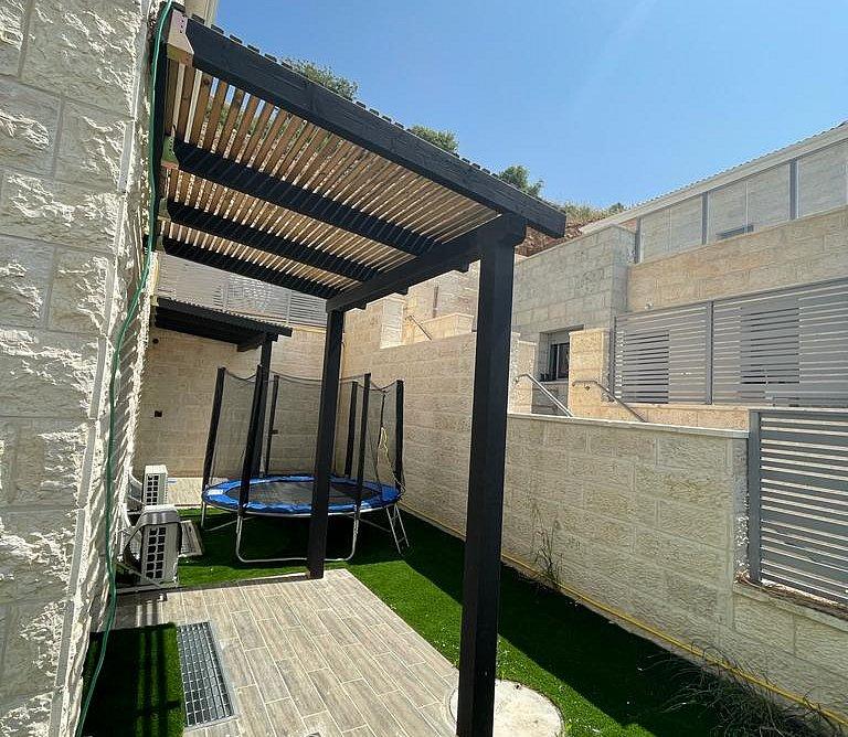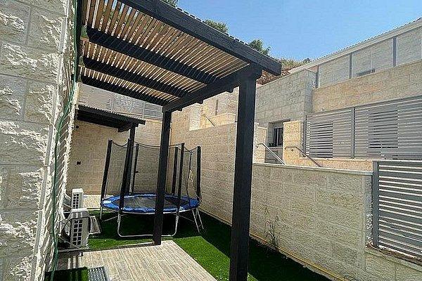 יציאה למרפסת הכוללת  טרמפולינה לילדים ומגוון עצי פרי