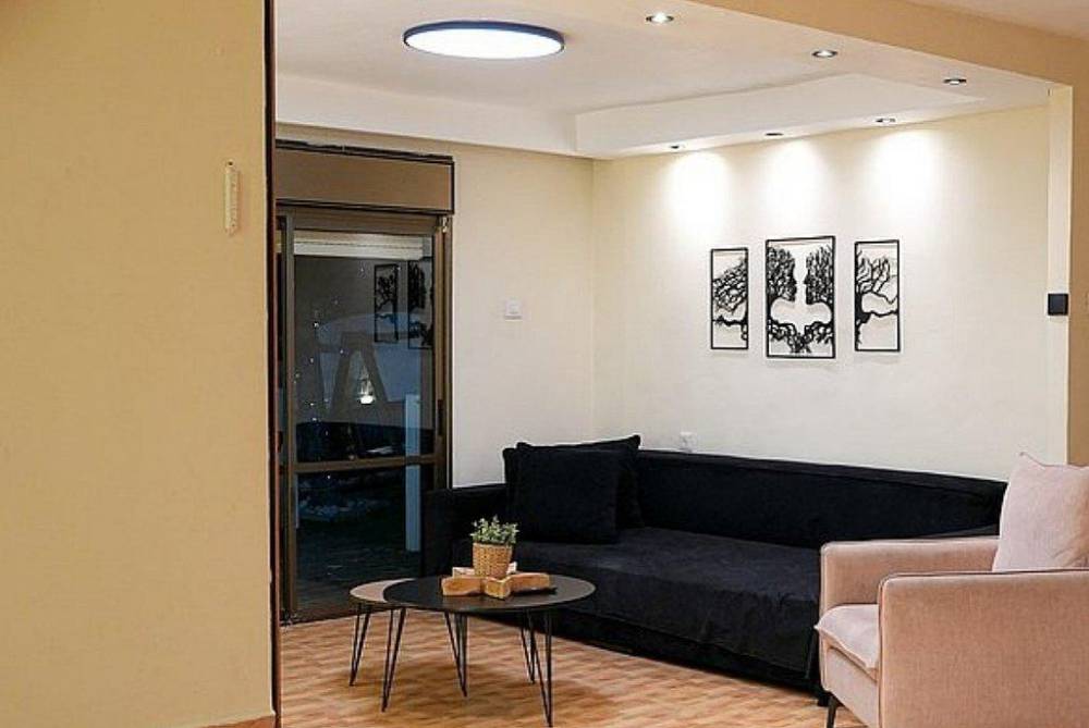 סלון אל מול מסך LCD בגודל 75 אינץ', חיבור לכבלים, ספה וכורסה