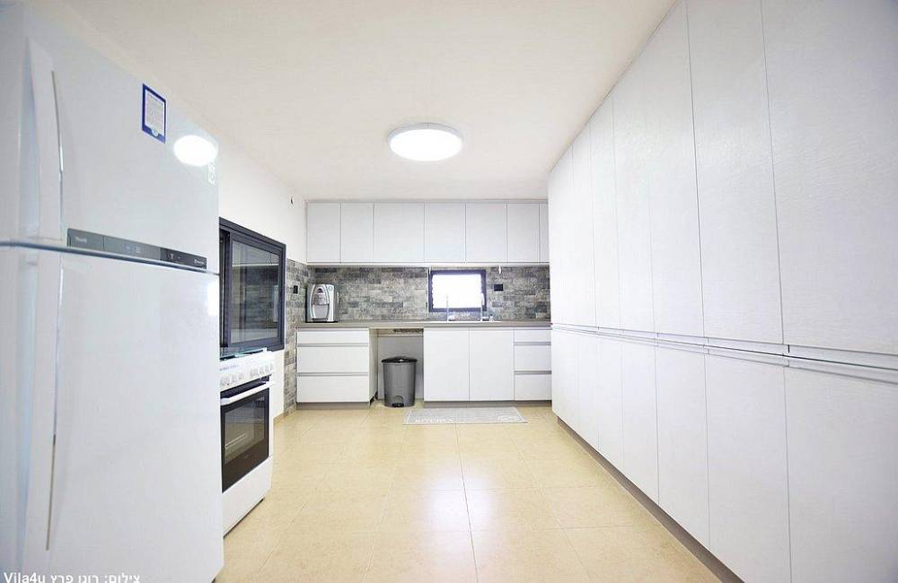 מטבח מאובזר הכולל בתוכו: מקרר גדול, תנור אפייה, מיקרוגל, מדיח כלים, כיריים גז, שני כיורים, כלי אוכל והגשה, פלטה ומיחם לשבת