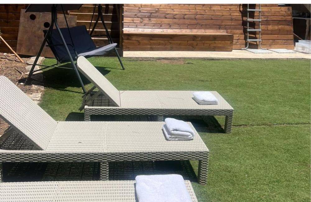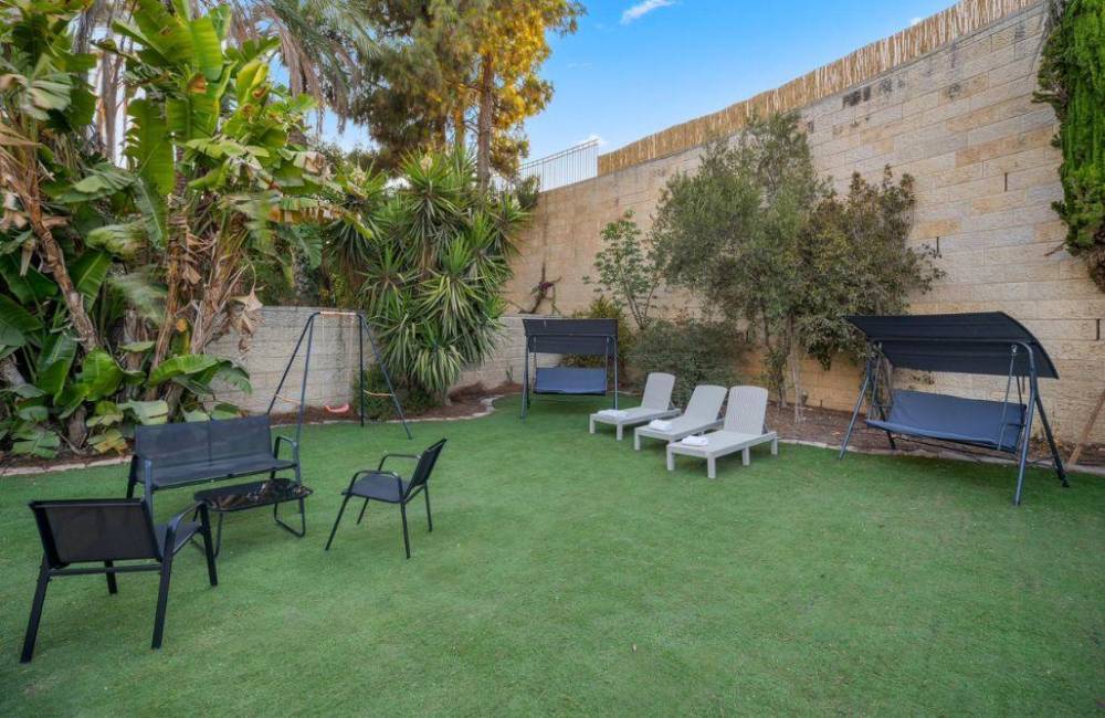 מתחם חיצוני מפנק בעל 200 מ"ר של גינה מטופחת עם בריכת שחייה, פינות ישיבה חיצוניות, פינת מנגל, נדנדות, ואווירה של חופש אמיתי.