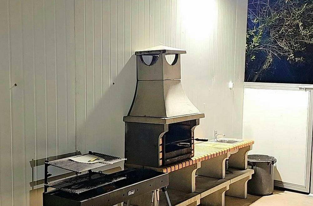 עמדת מנגל מקצועית מאבן עם כיור ומשטח עבודה.
