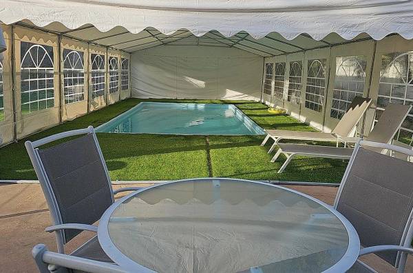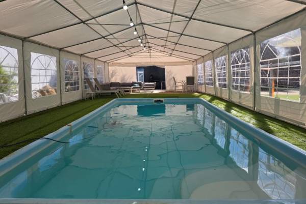 בריכת שחייה בנויה, מגודרת עם שער, מחוממת ומקורה לחורף.