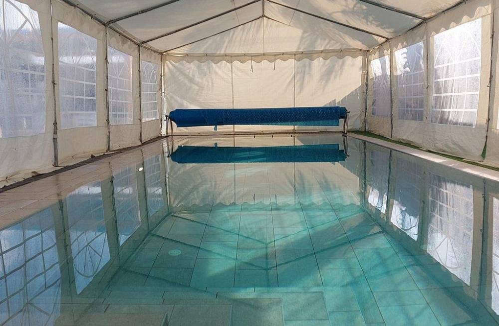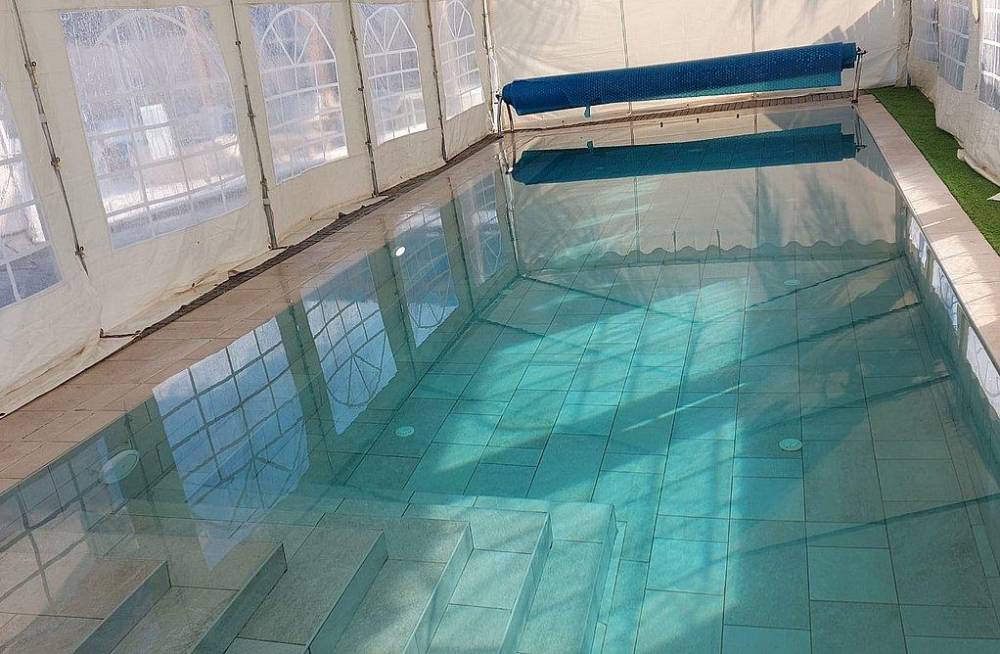 בריכת שחייה צלולה מחוממת ומקורה, גודל הבריכה: 10 על 3 ולה תאורה לילית