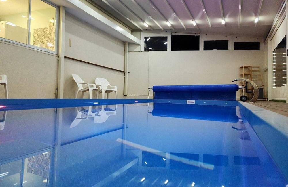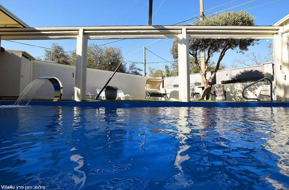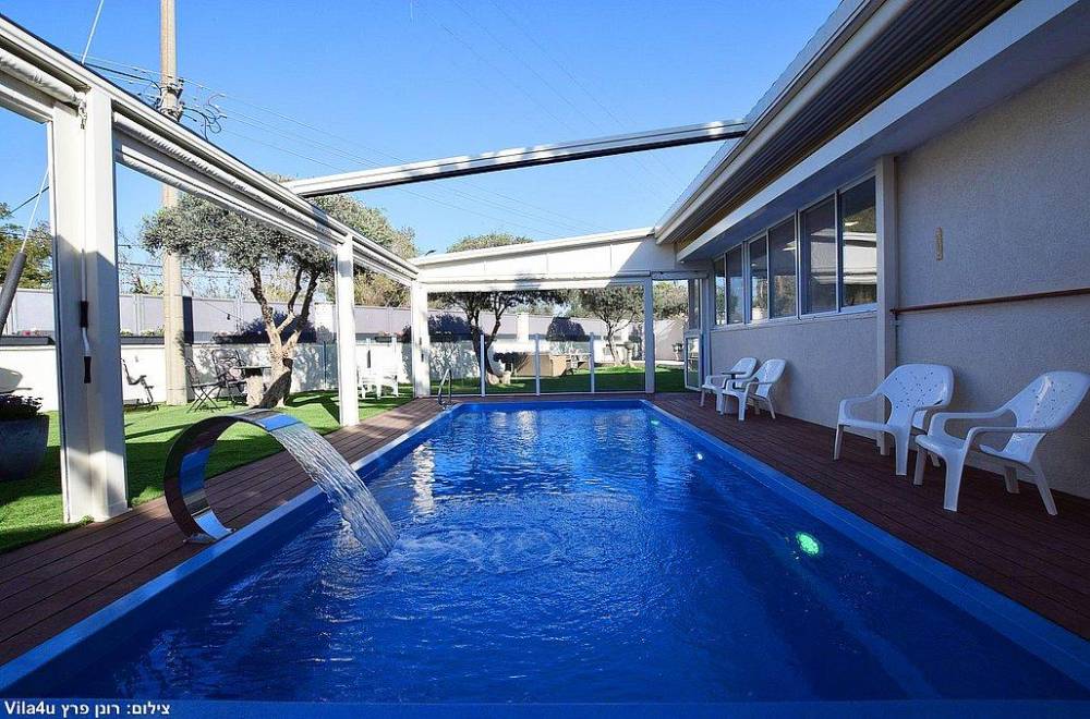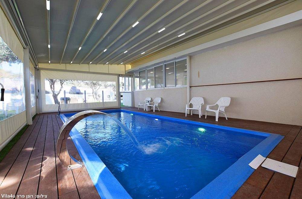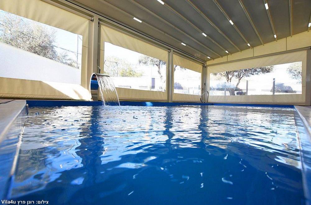 בריכת שחייה בגודל 7X3 עם מפל מים, הבריכה מחוממת מקורה בחודשי החורף וכוללת סוכך חשמלי נפתח ונסגר