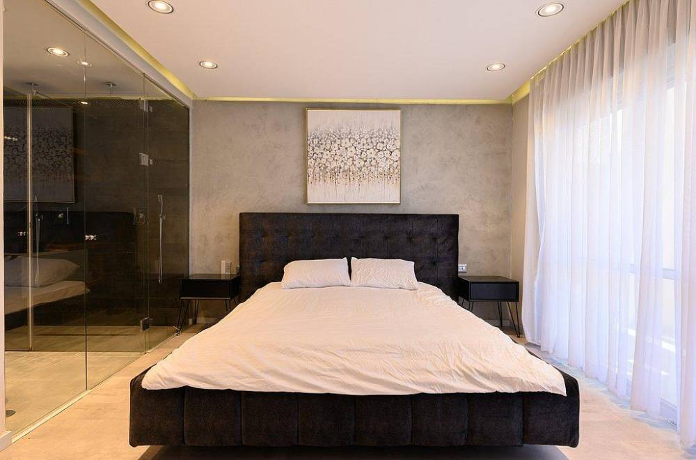 חדר שינה > מיטה זוגית קינג סייז, טלוויזיה בגודל 50 אינץ עם חיבור לHOT, מזגן, שידות לאחסון וקומודה.