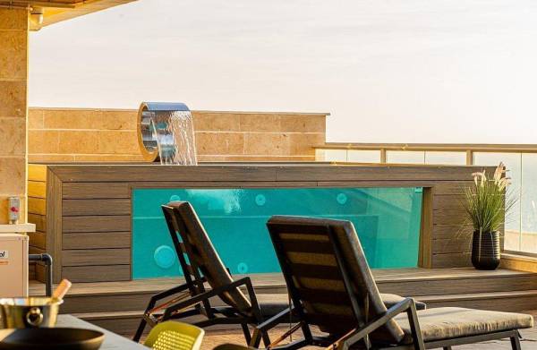 בריכה חצי שקופה מחוממת עם מפל מים
