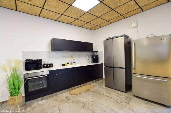 מטבח מאובזר הכולל: 2 מקררים, מיקרוגל תנור אפייה, כיריים חשמליות, 2 כיורים, כלי אוכל בשרים וחלביים, מיני בר מים.