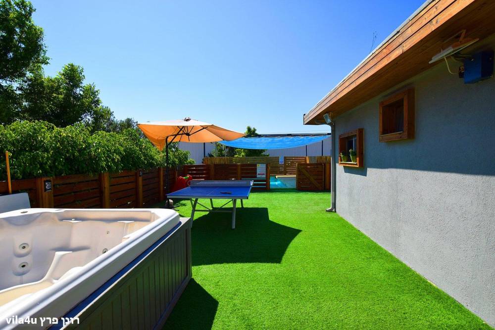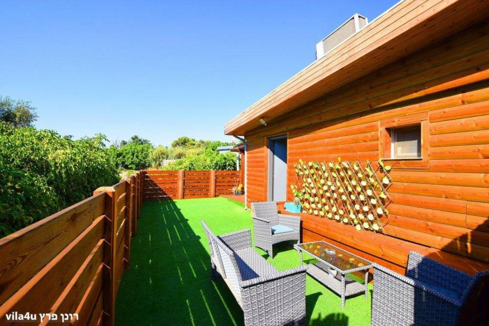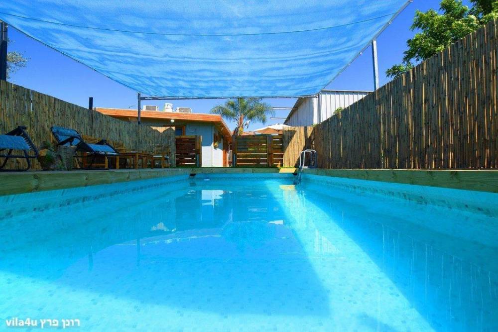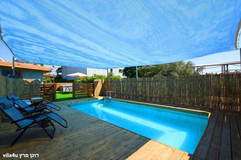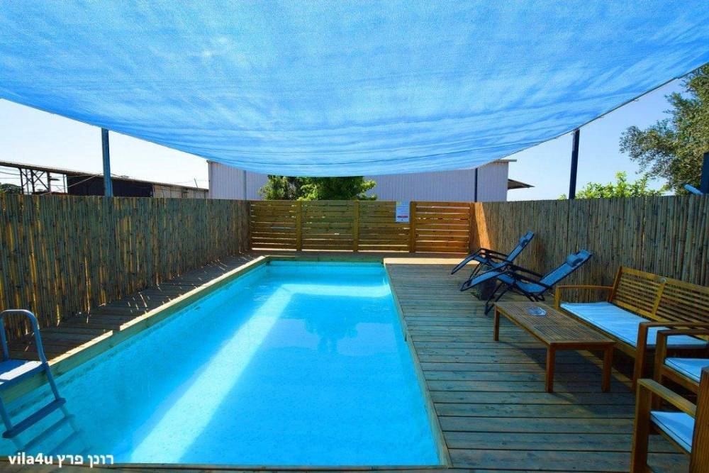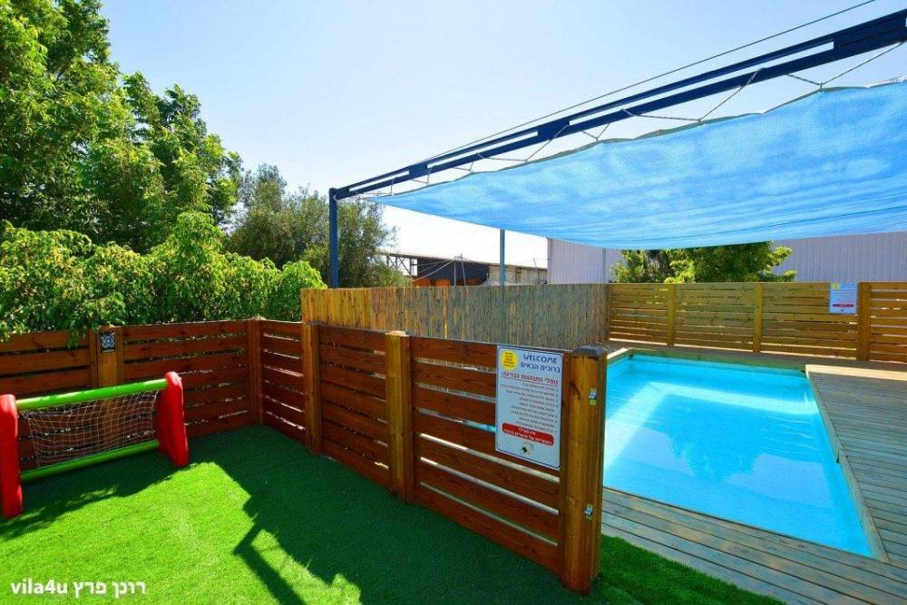חצר מרווחת עם מדשאה ובריכת שחיה מחוממת מחופה דק עץ ומגודרת גודל הבריכה 8 על 4