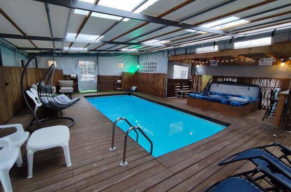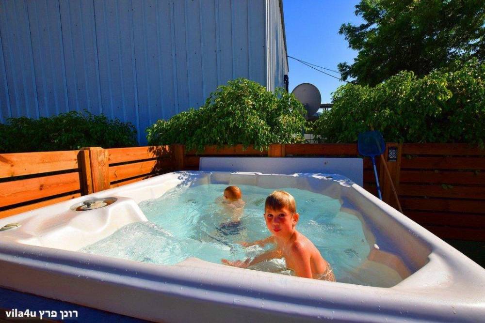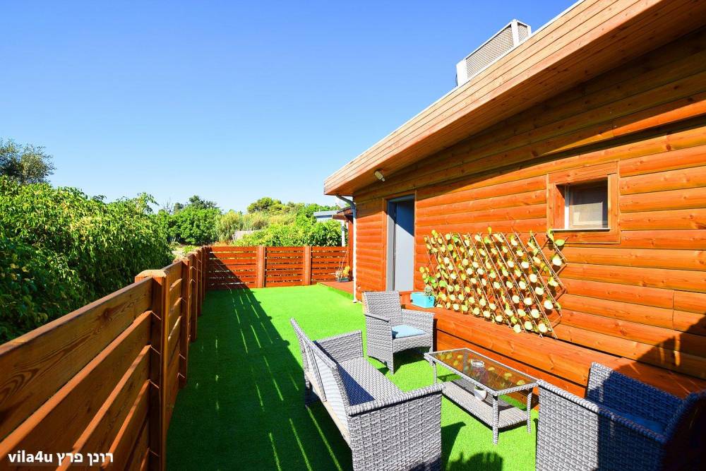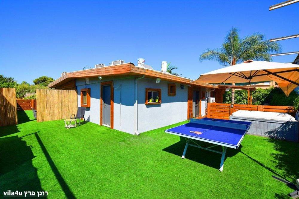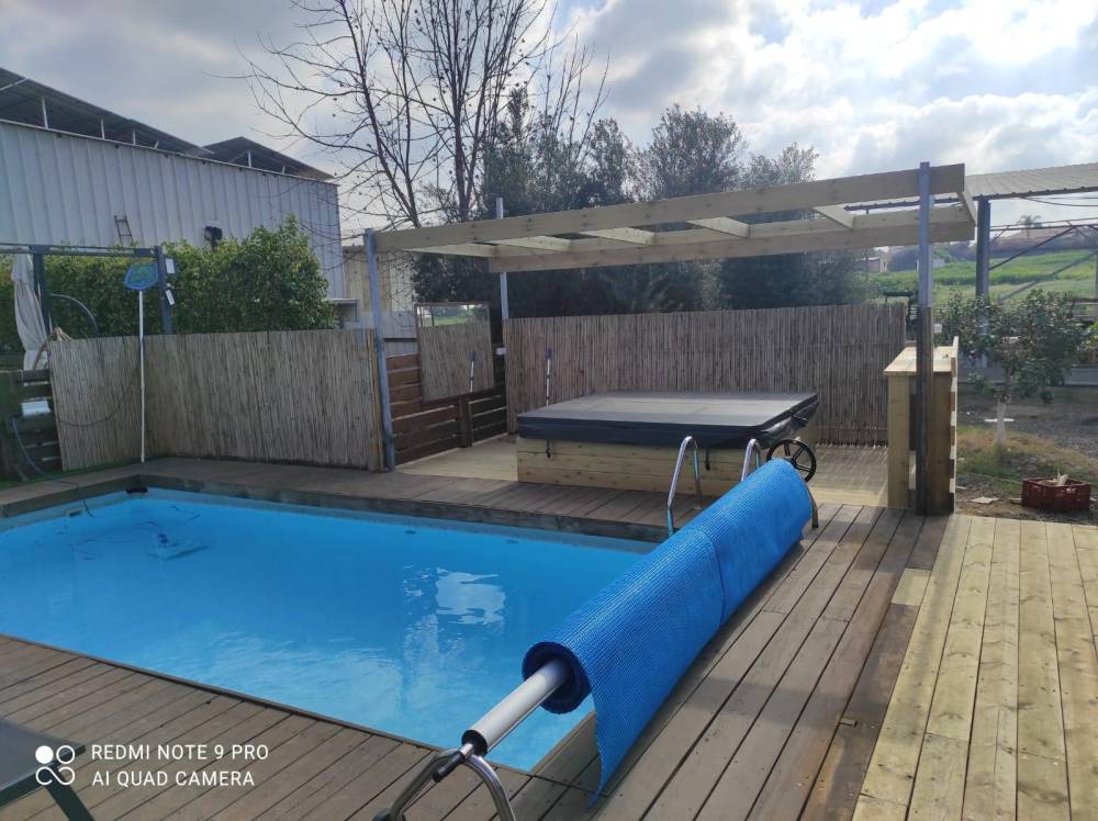 חצר מרווחת עם מדשאה ובריכת שחיה מחוממת מחופה דק עץ ומגודרת גודל הבריכה 8 על 4