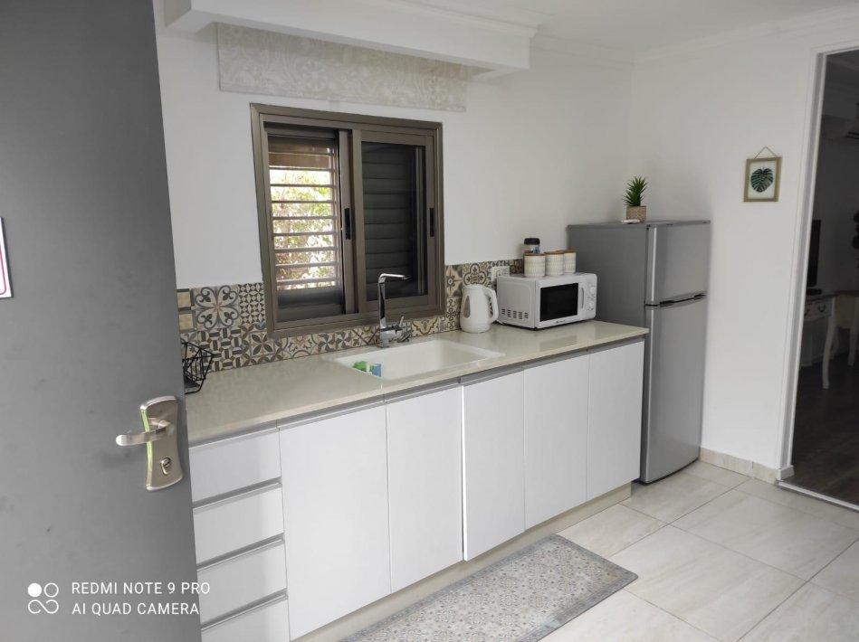 מטבח מאובזר גדול עם תנור אפיה , מקרר, כיריים על גז, קומקום חשמלי, מיקרוגל, כלי אוכל