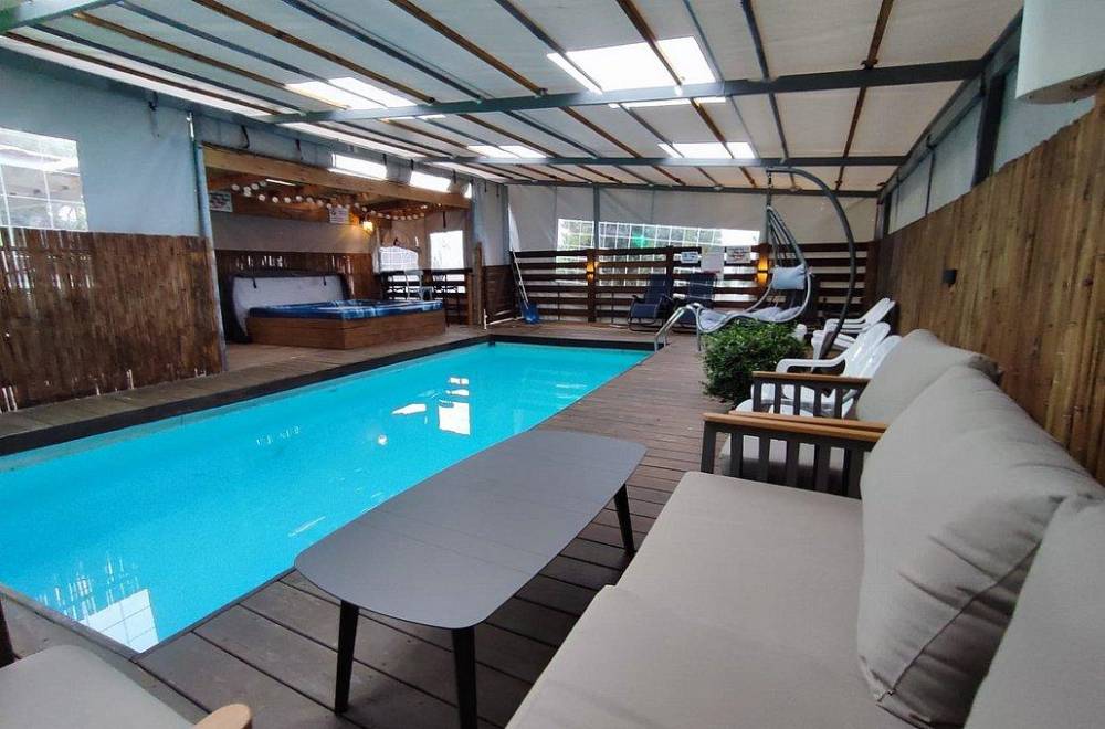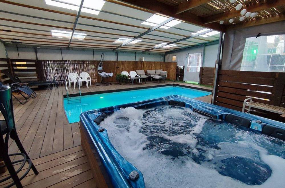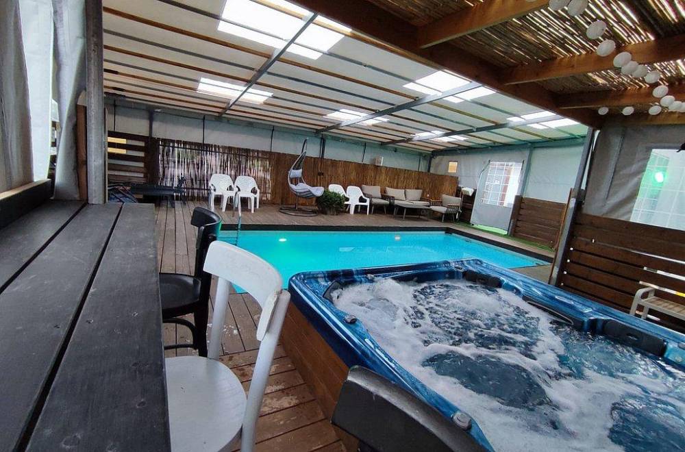 פינת ישיבה מוצלת ומיטות שיזוף על שפת הבריכה