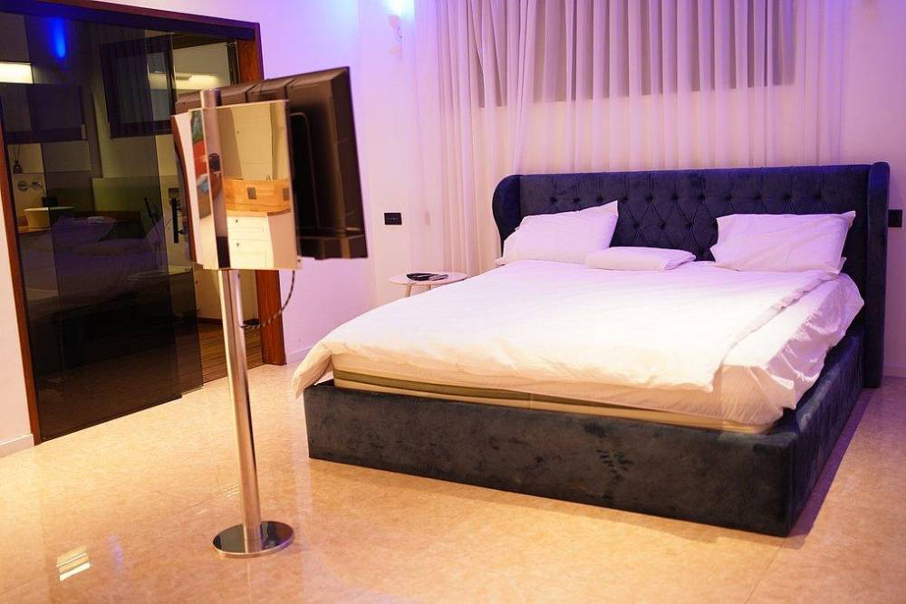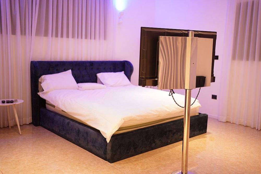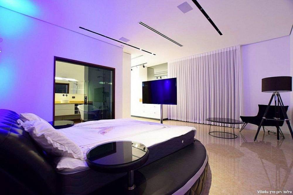 מיטה זוגית מוצעת, מיזוג אוויר, שידה, פינת ישיבה וחדר רחצה עם שירותים, בידה, ואמבטיה