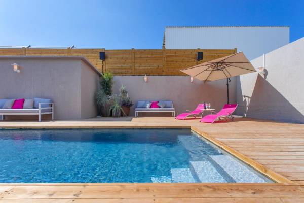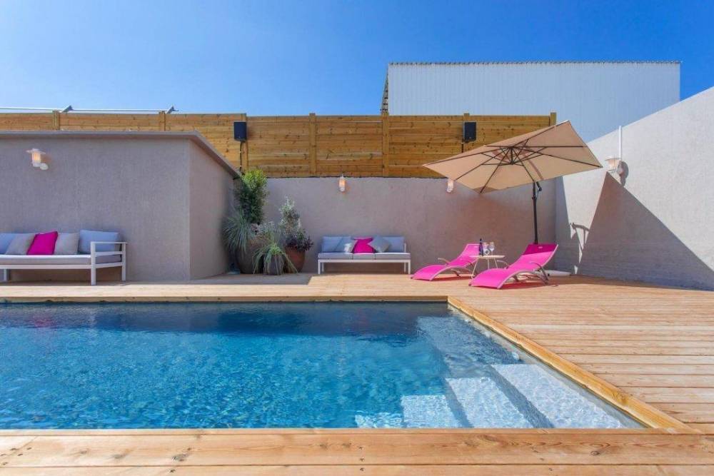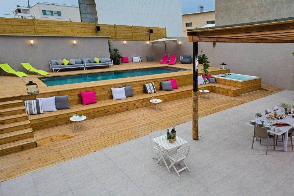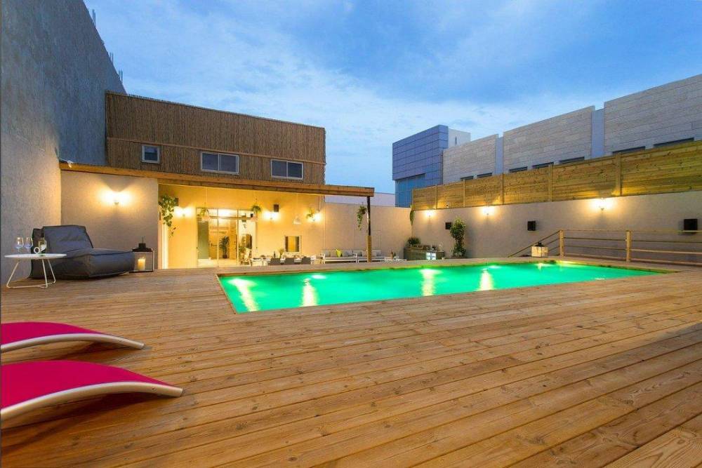בריכה מחוממת ומקורה (בעונת החורף) עם תאורה לילית בגודל 10 על 3 מטר, מחופה ברצפת דק איכותית