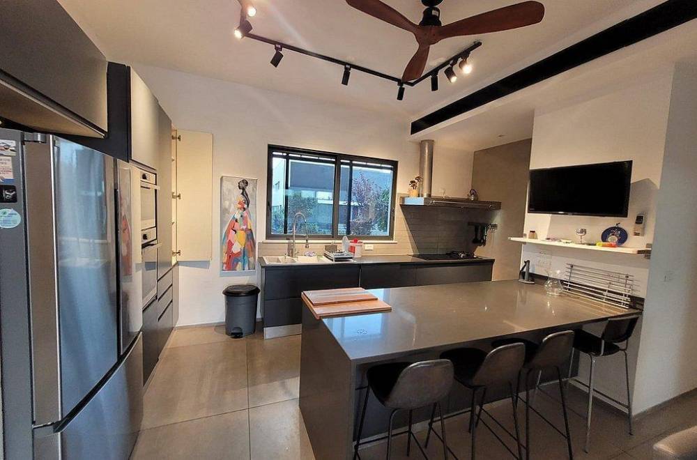 מטבח מאובזר הכולל אי עם כסאות בר, כיריים חשמליות, כיור כפול, מקרר גדול, 2 תנורים, כלי אוכל והגשה