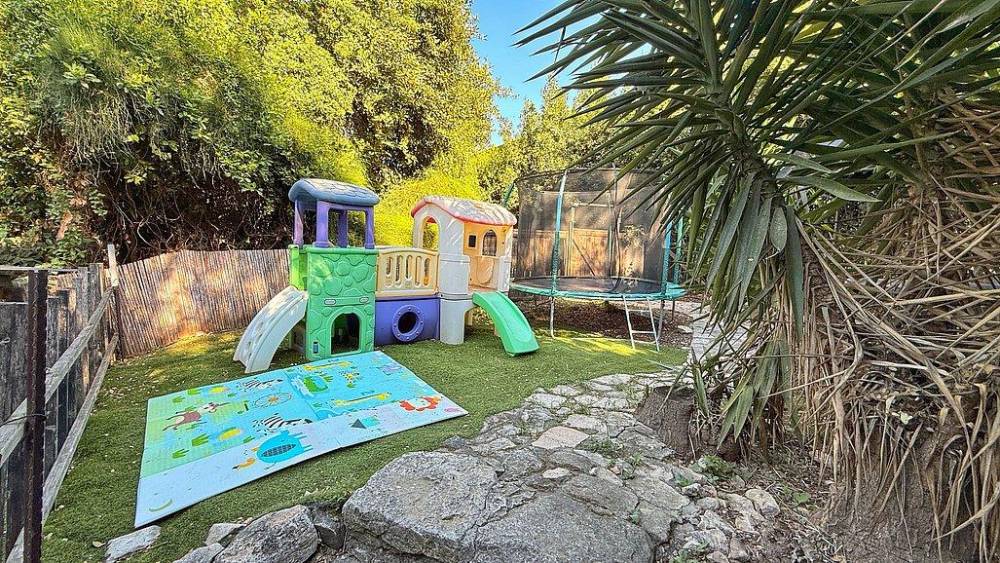 מתחם לילדים עם מגלשות, נדנדות וטרמפולינה