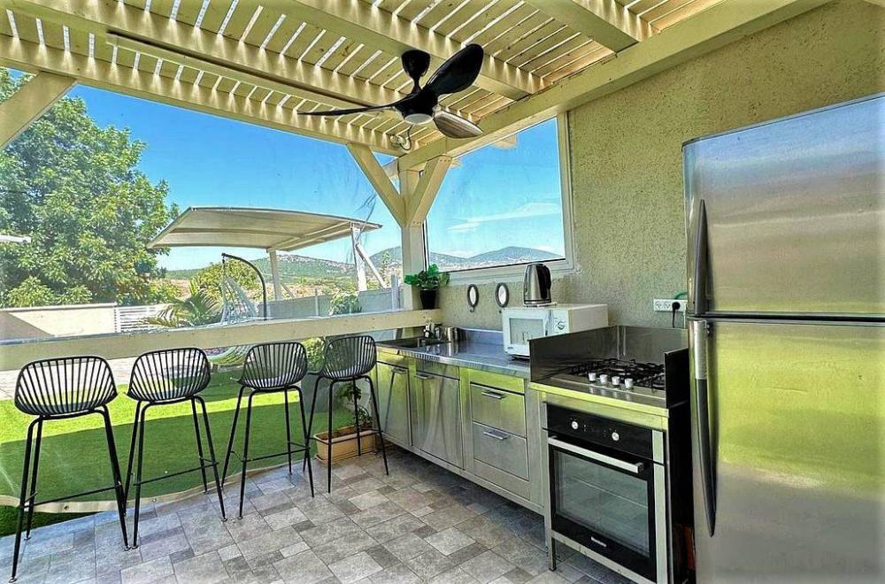 עמדת ברביקיו מוצלת עם מאוורר, משטח עבודה, מקרר, כיריים, תנור, מיקרוגל, קומקום חשמלי ופינת ישיבה.