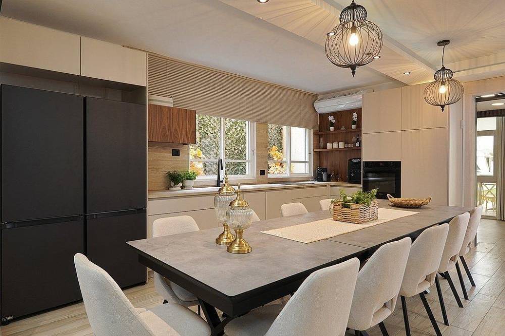 מטבח מאובזר: מקרר, מיקרוגל, מכונת אספרסו, כיריים חשמליות, מדיח כלים, כלי אוכל והגשה