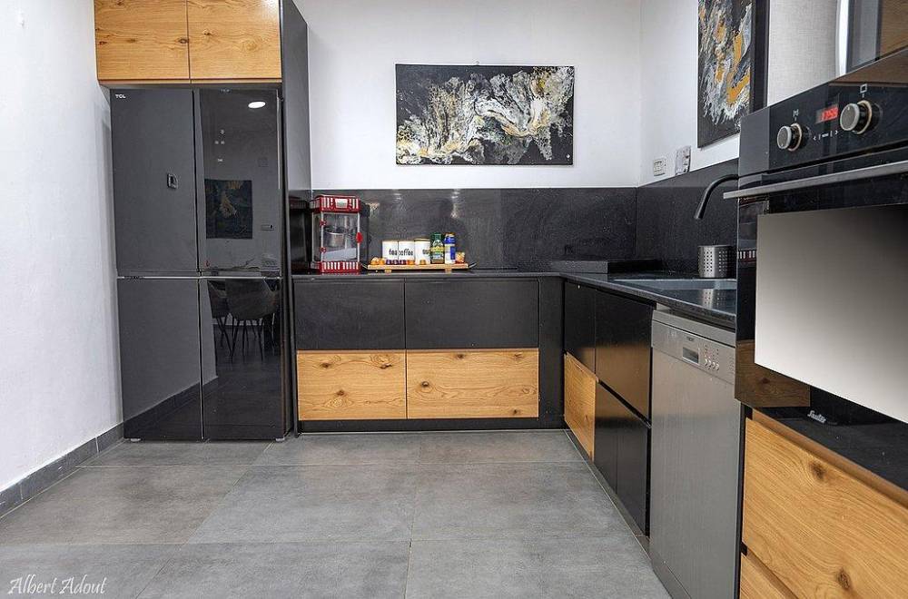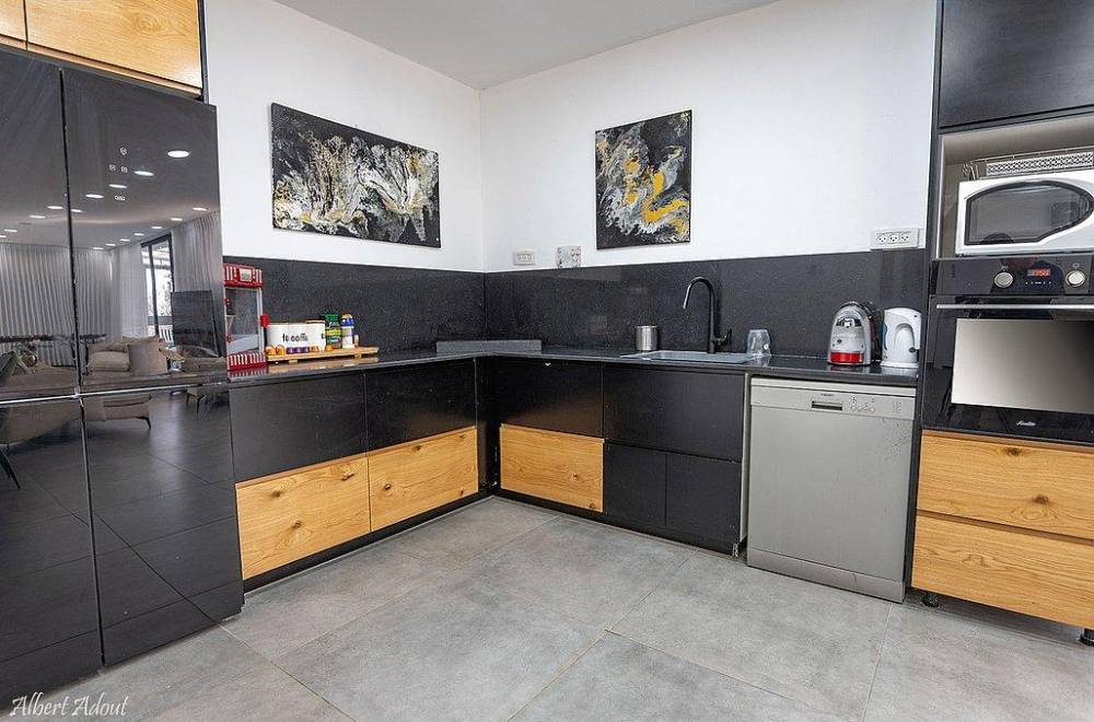 מטבח מאובזר קומפלט הכולל מקרר, תנור אפייה, מדיח כלים, כיריים חשמליות, מכונת אספרסו, קומקום חשמלי, מיקרוגל, כלי אוכל והגשה