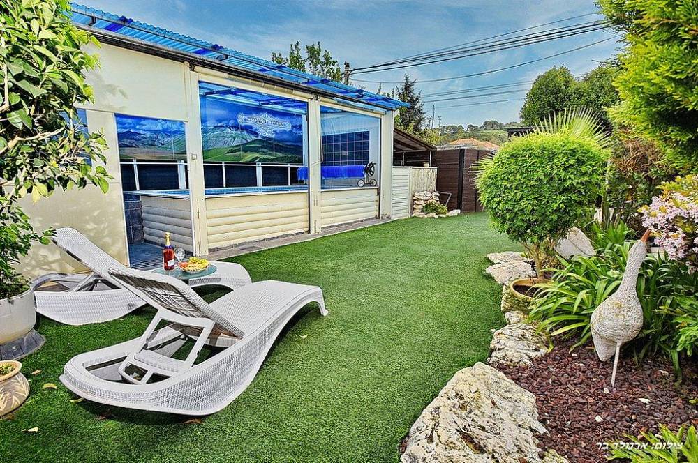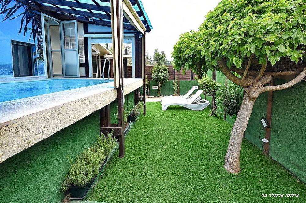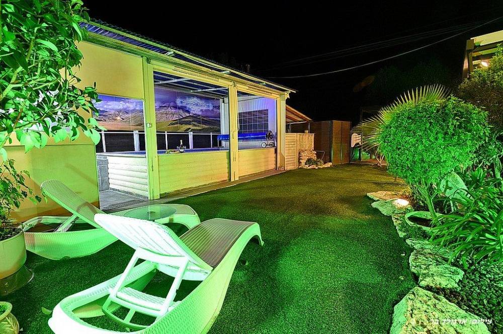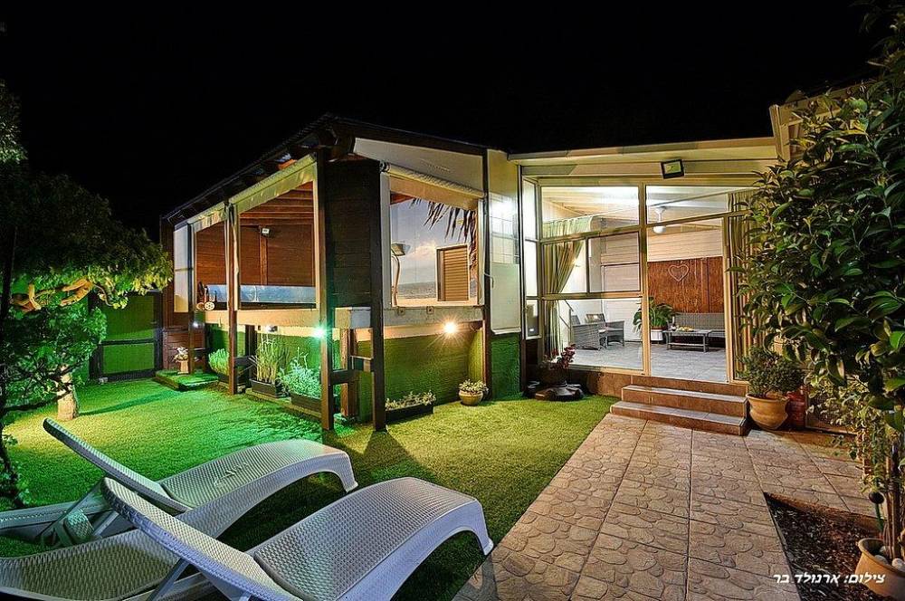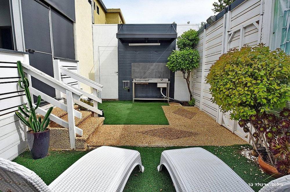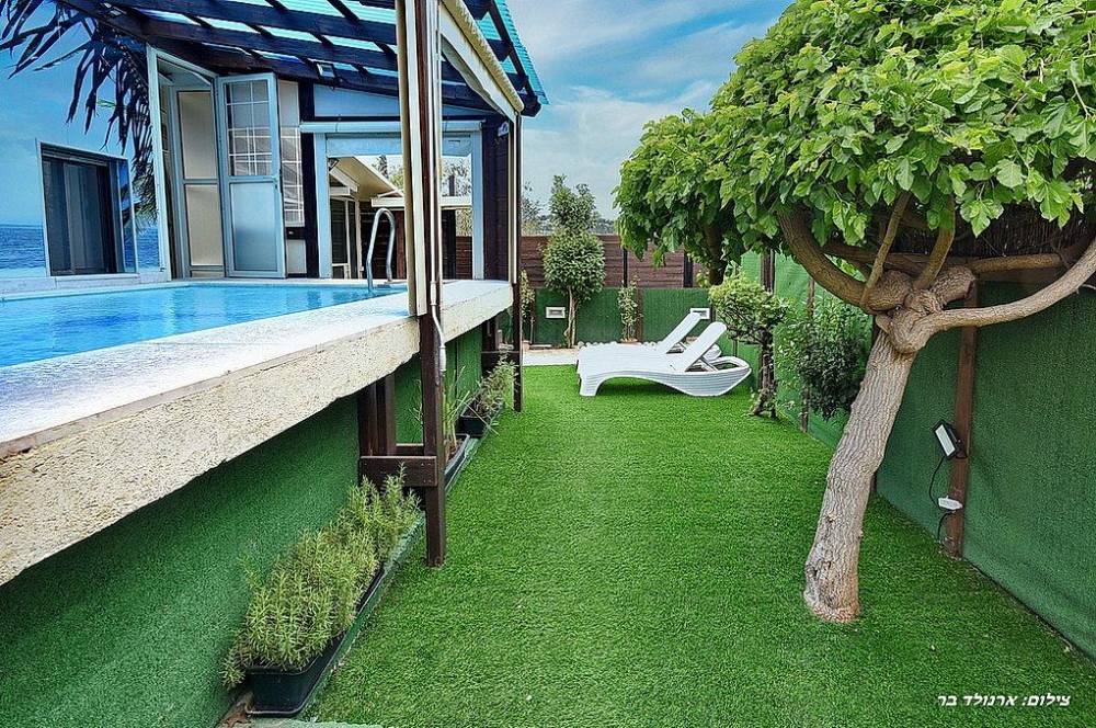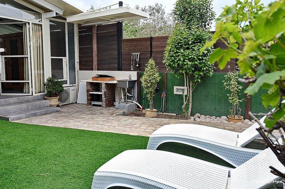 חצר הכוללת מדשאה ירוקה, תאורה לילית, ריהוט גן, מיטות שיזוף ופינת מנגל