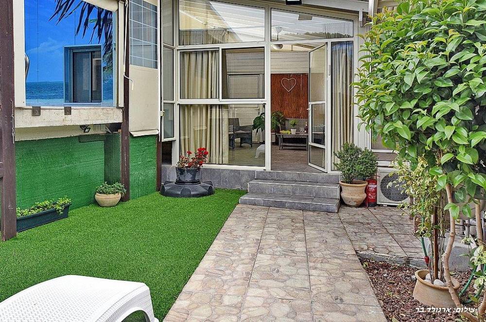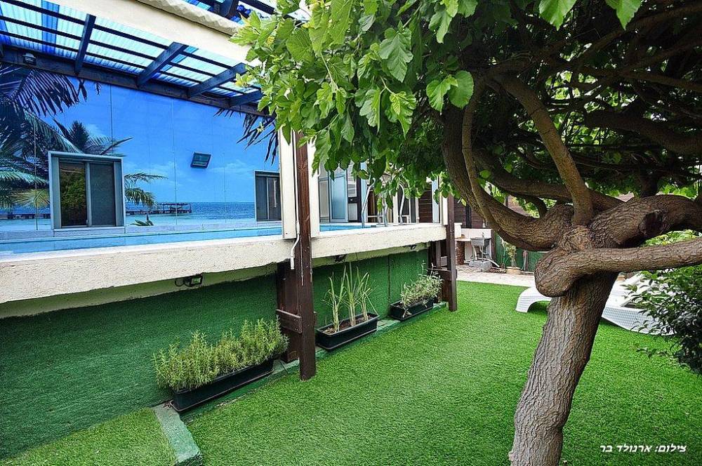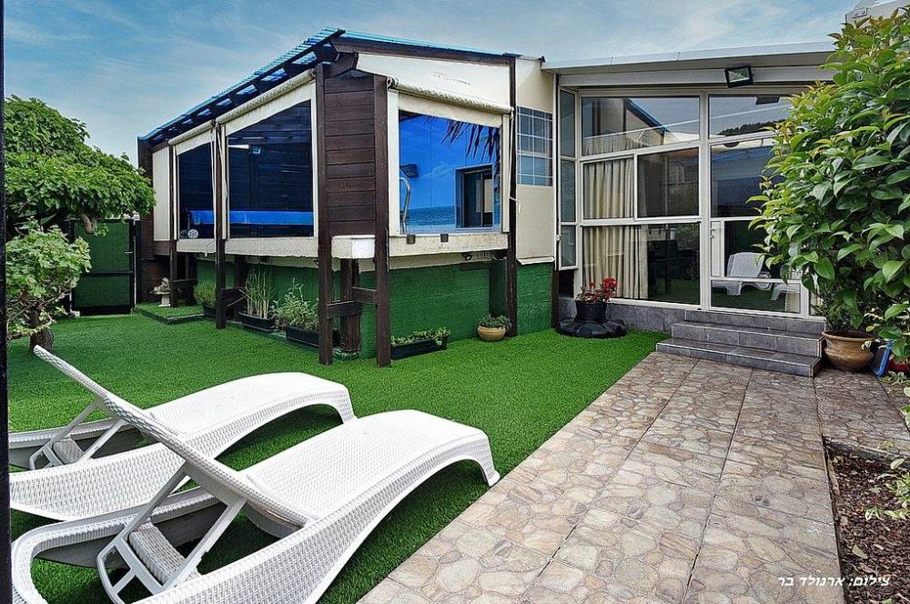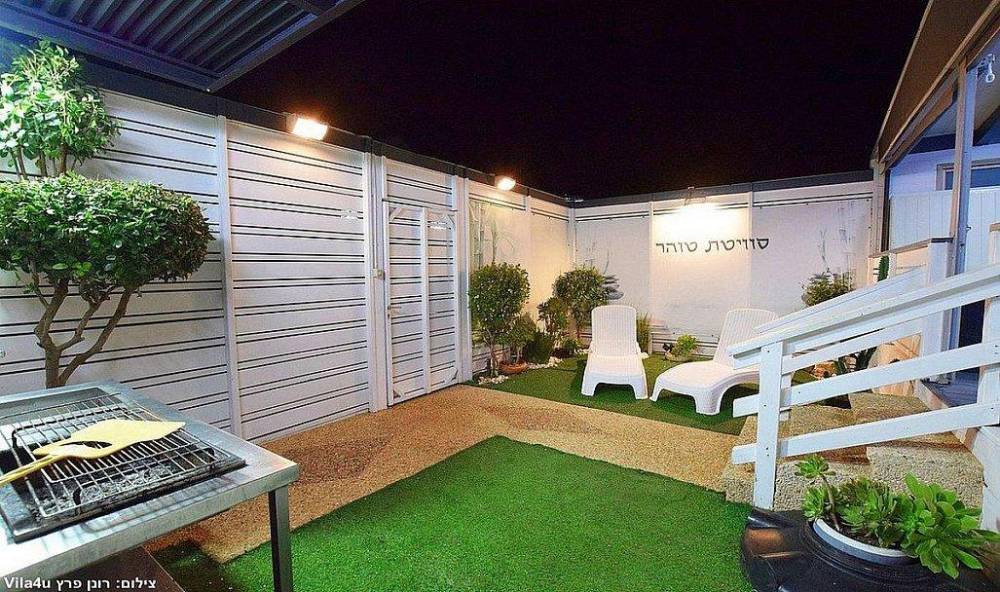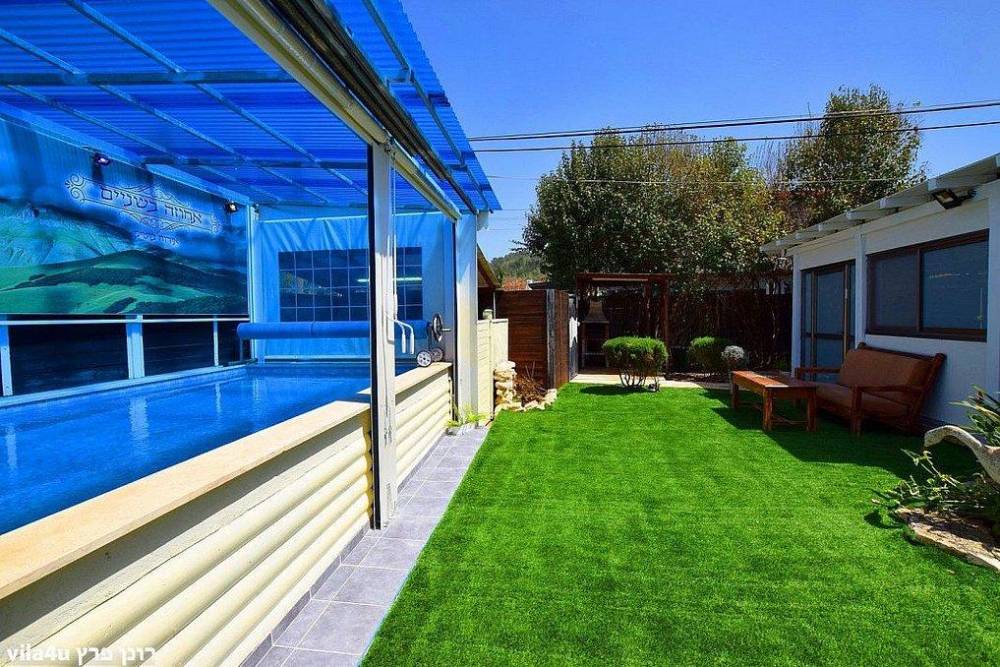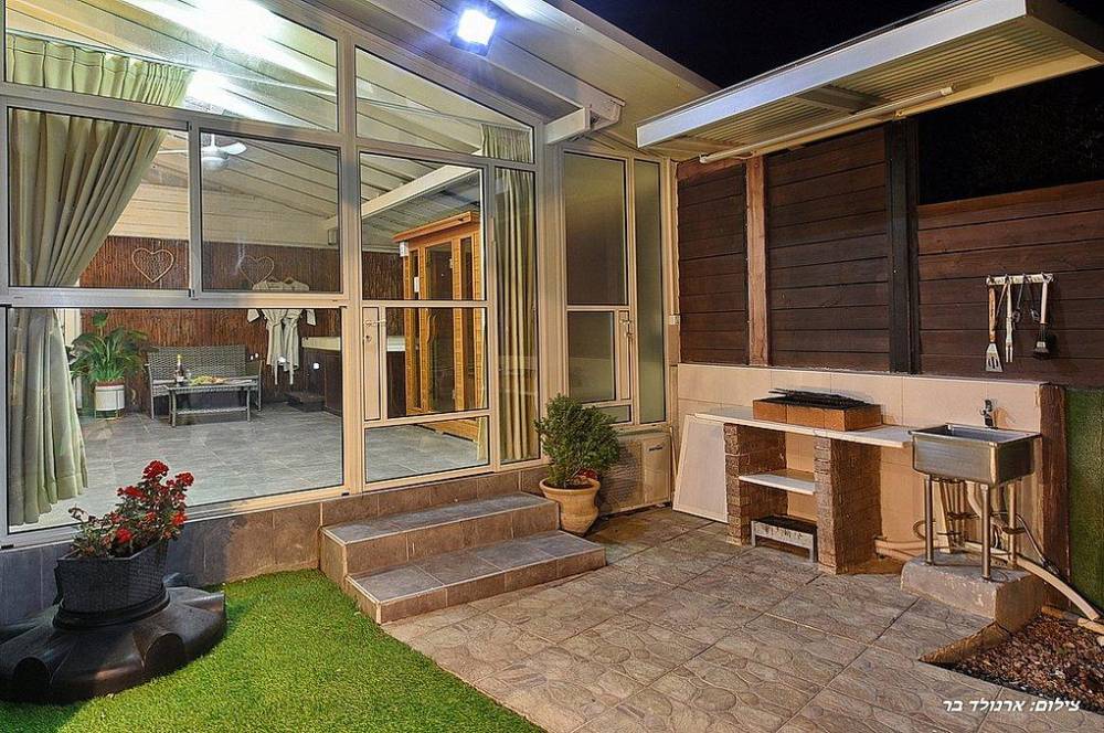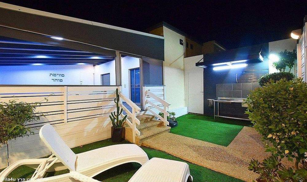חצר הכוללת מדשאה ירוקה, תאורה לילית, ריהוט גן, מיטות שיזוף ופינת מנגל