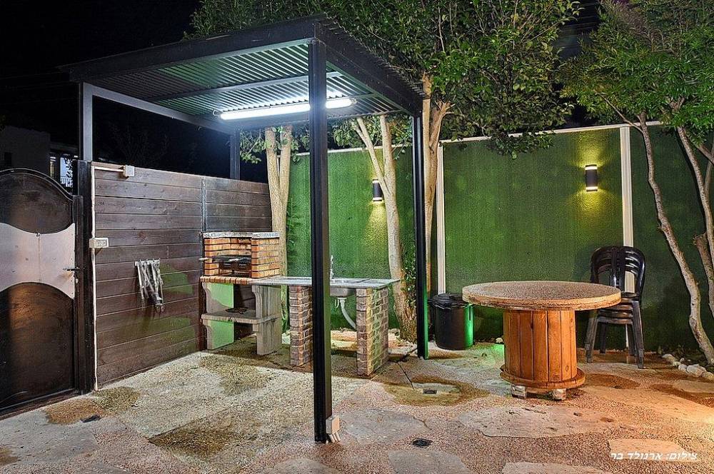 חצר מטופחת עם תאורה לילית, עמדת מנגל פרטית וכיסאות שיזוף