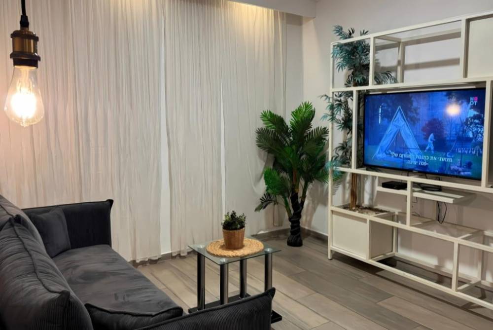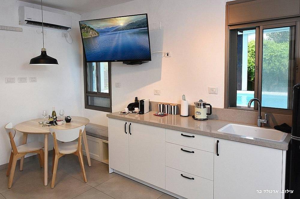 בסוויטה מיטה זוגית, מטבח מאובזר, חדר רחצה, פינת אוכל, מסכי צפייה