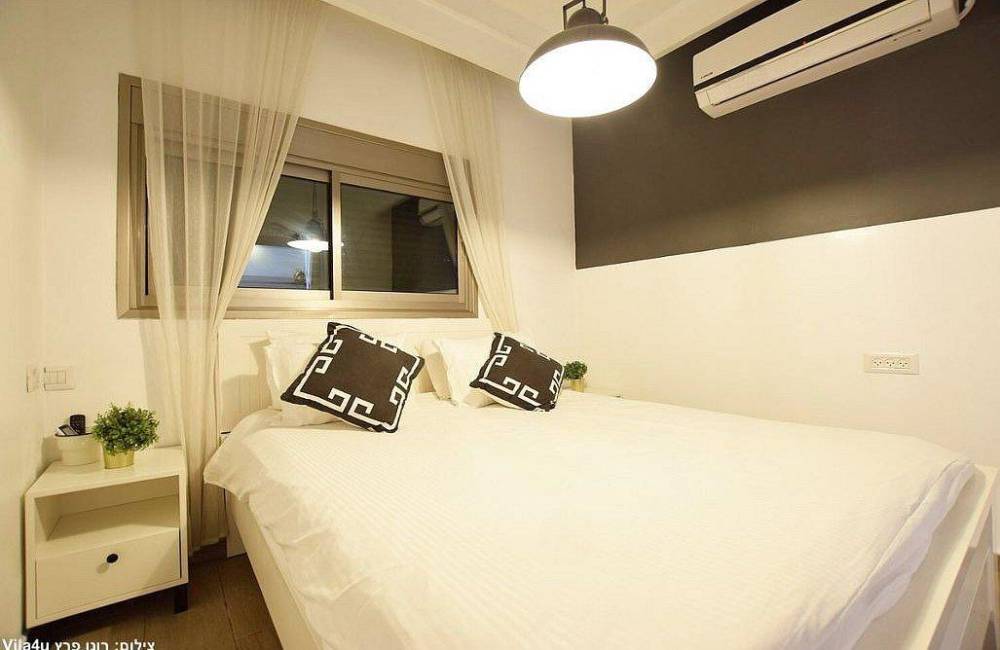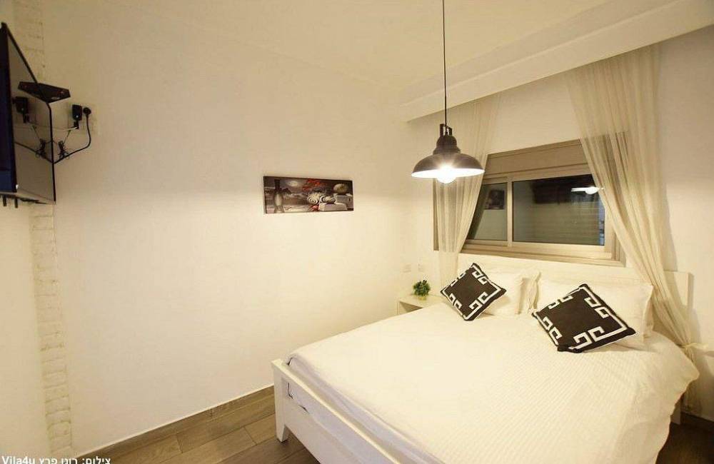חדר הורים הכולל מיטה זוגית, טלוויזיה ומיזוג אוויר