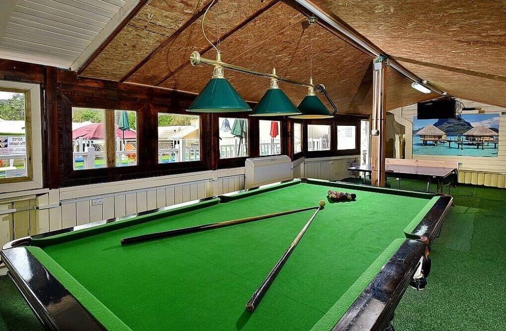 חדר הכולל שולחן סנוקר עם טלוויזיה מיזוג אוויר ושירותים