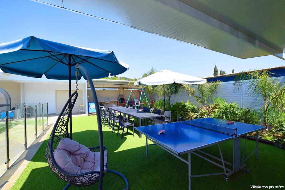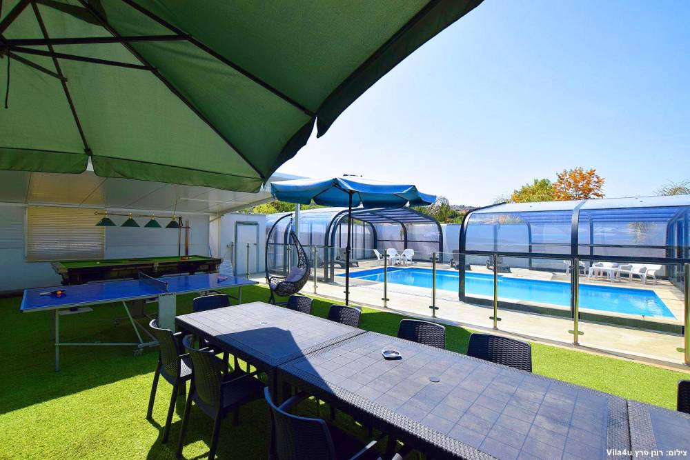 פינת אוכל מוצלת תחת גזיבו ופינת אוכל נוספת לצד עמדת הברביקיו