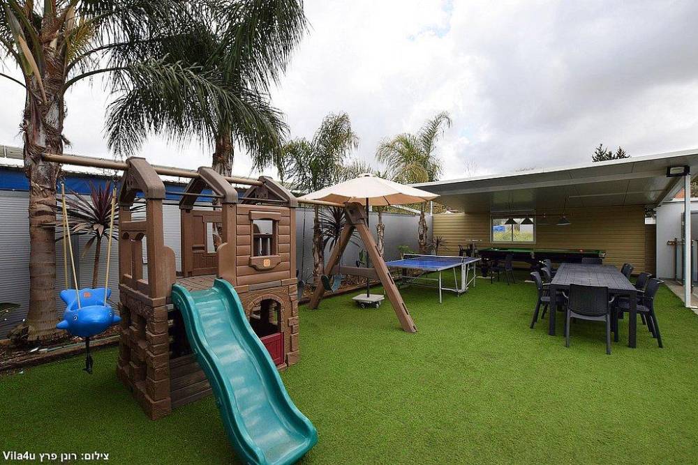 חצר גדולה משתרעת על חצי דונם שכולו פינוק, מדשאה רחבה וגדר תוחמת את המתחם