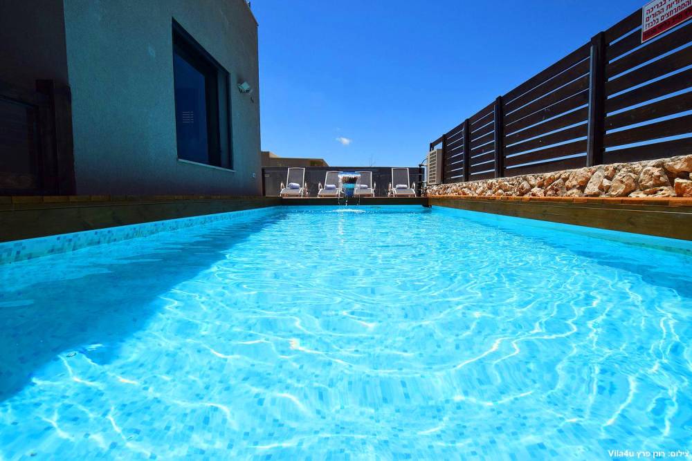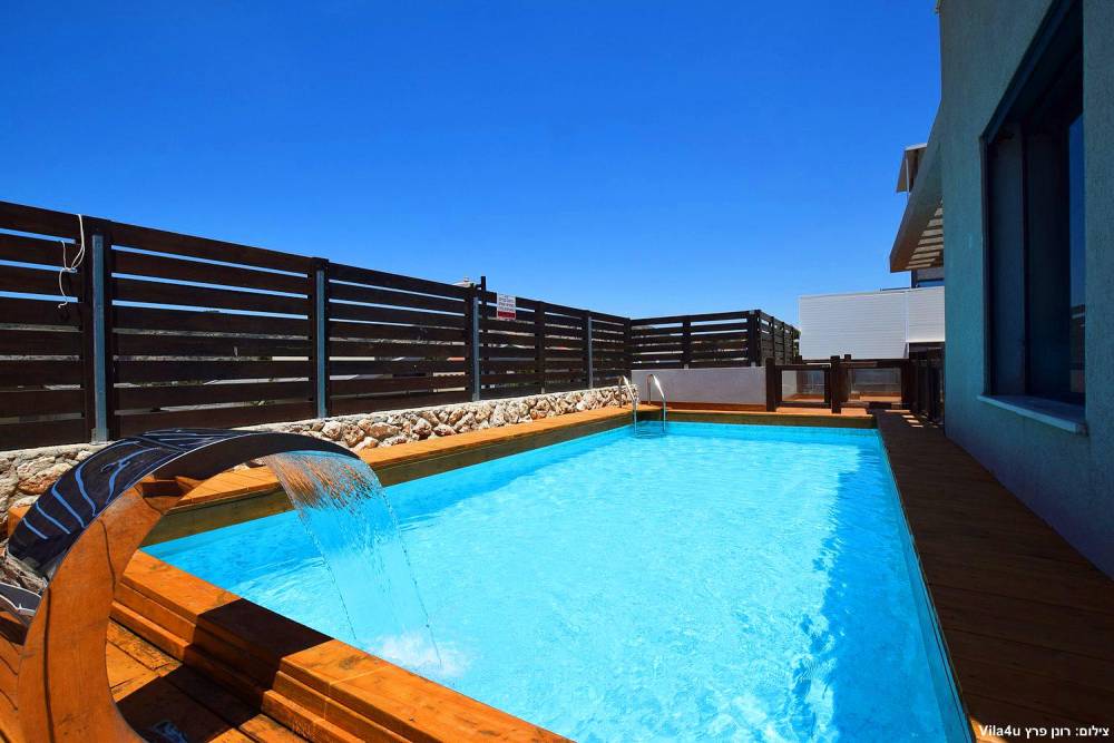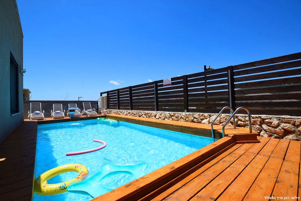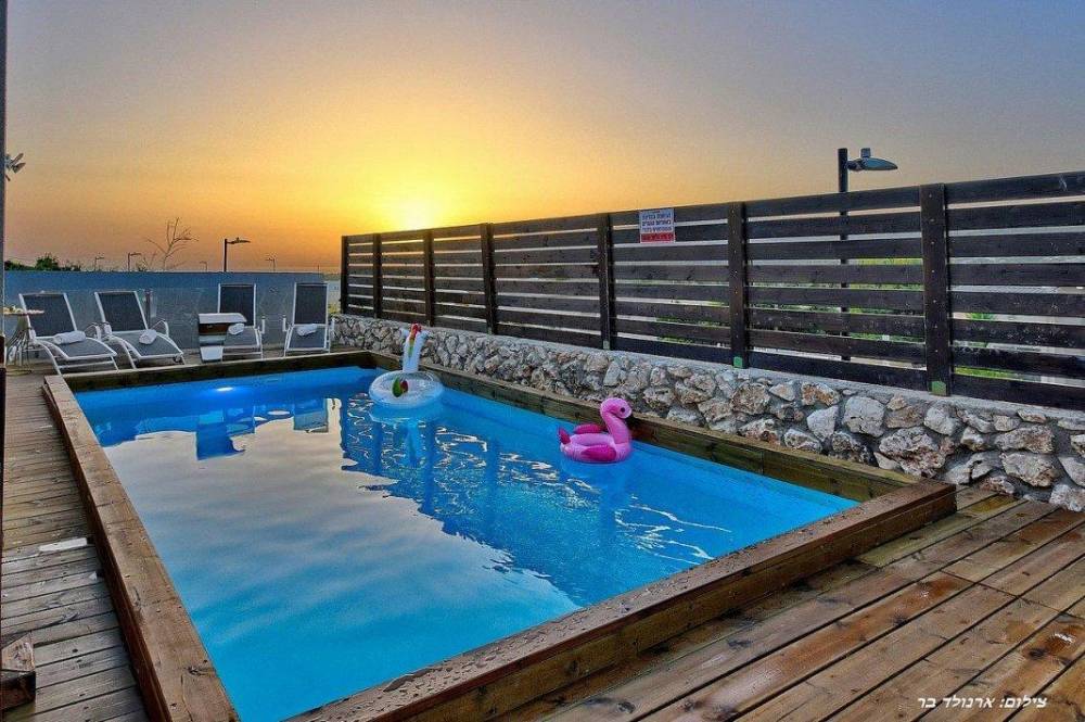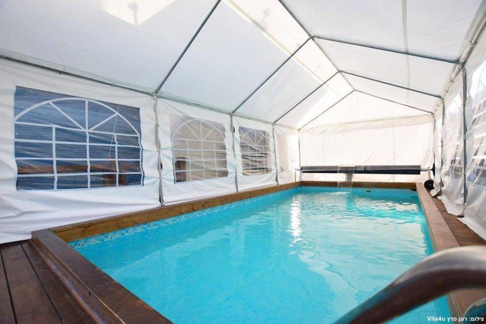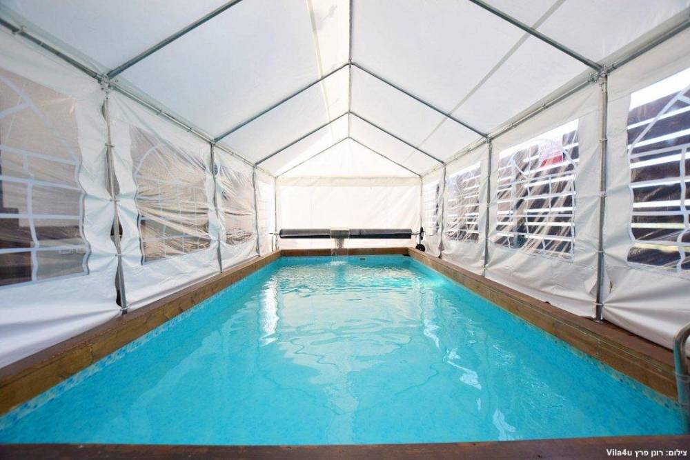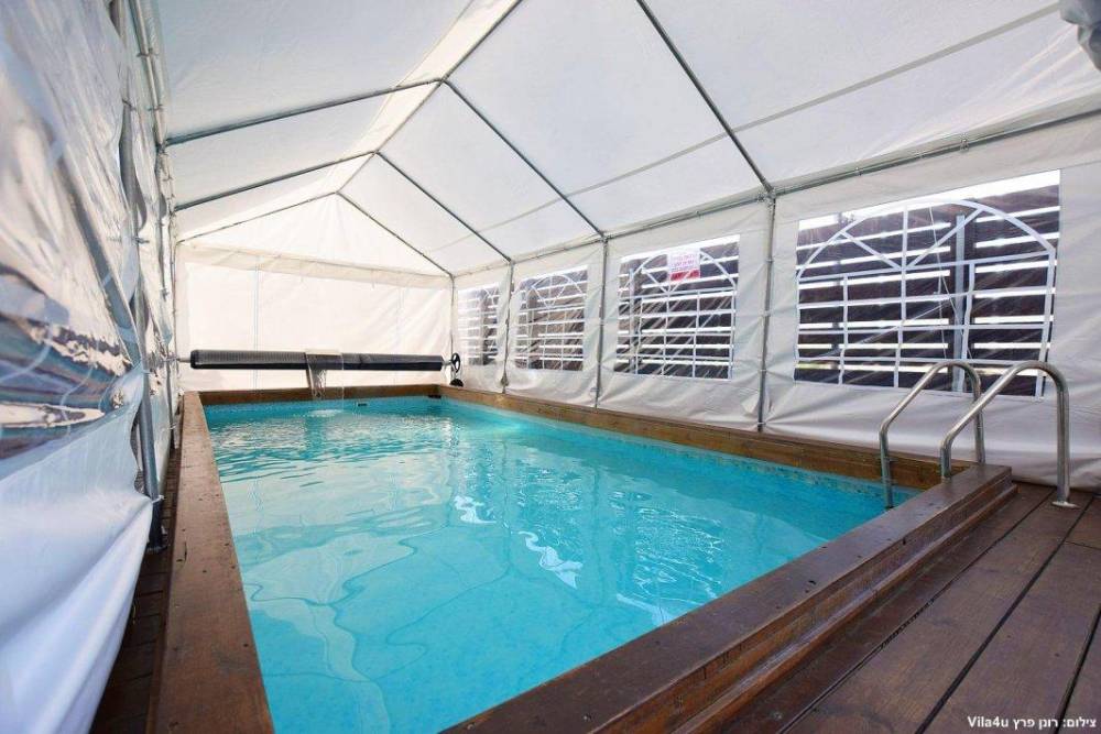 בריכת שחייה מחוממת ומקורה בחודשי החורף בגודל 8X4, מחופה ברצפת דק איכותי