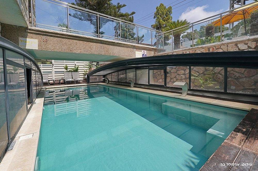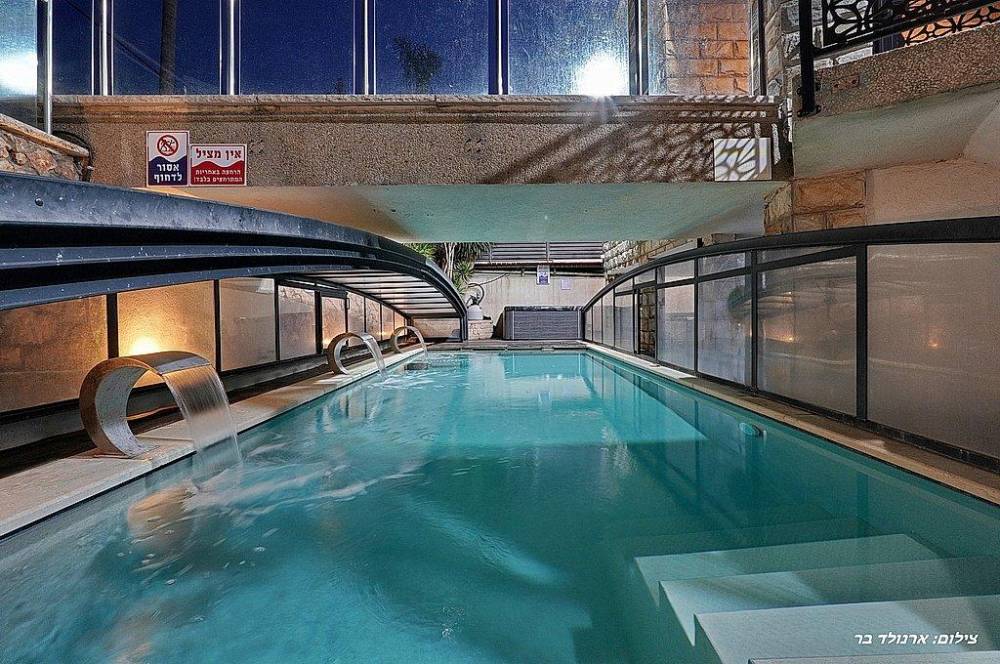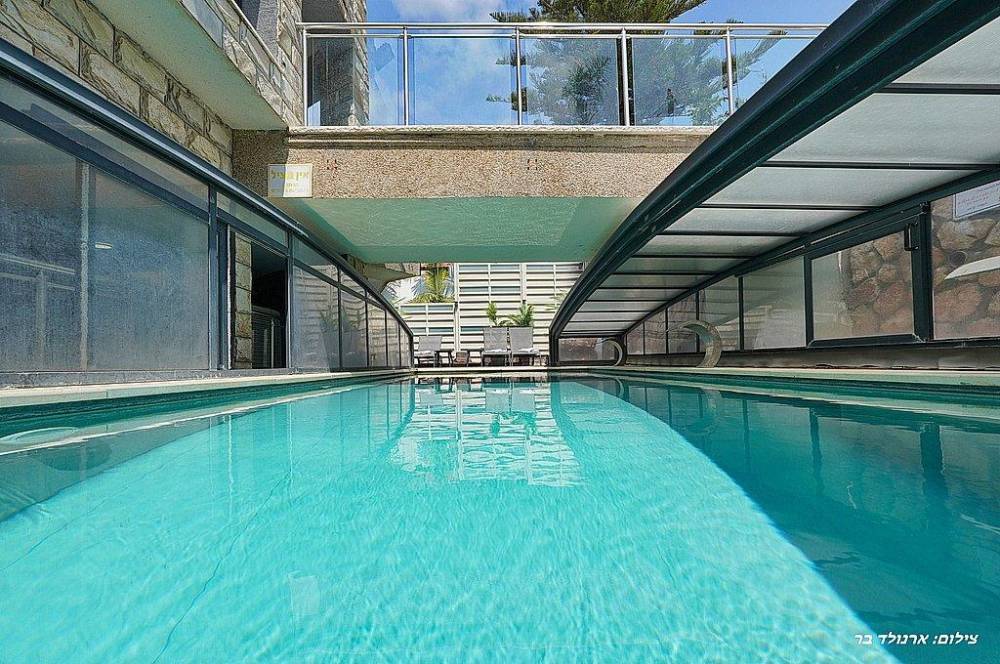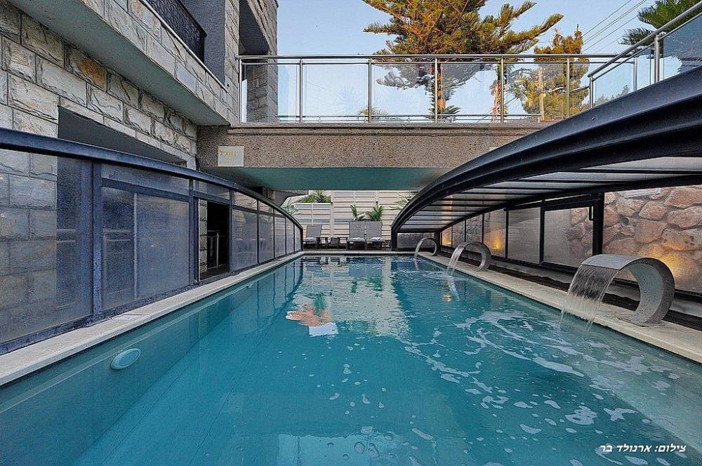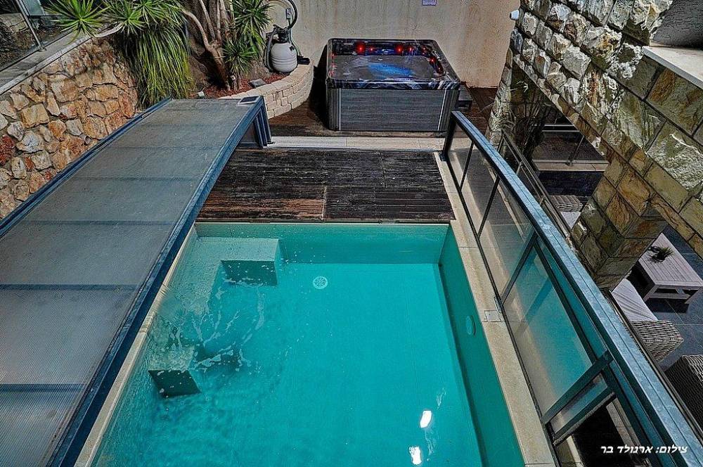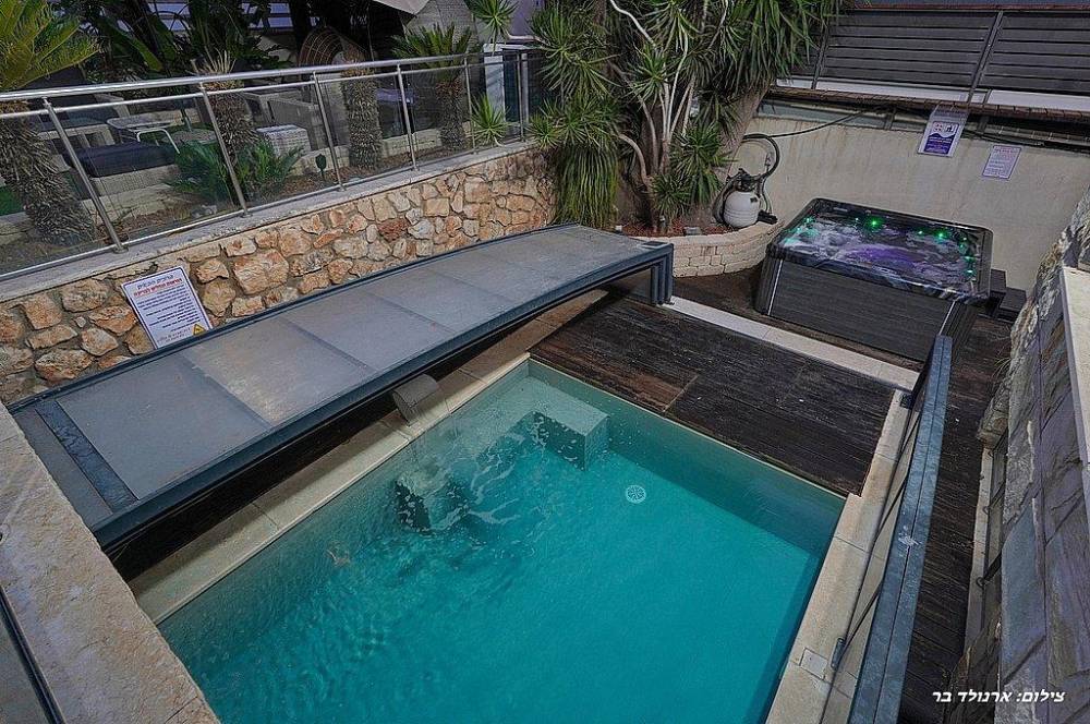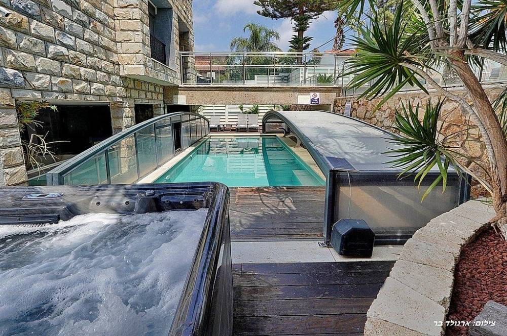 בריכת שחייה בגודל 10 על 4 מטר (מחוממת ומקורה בחורף) עם מפלי מים