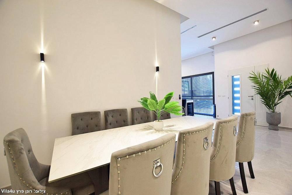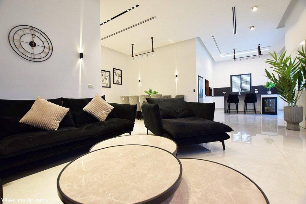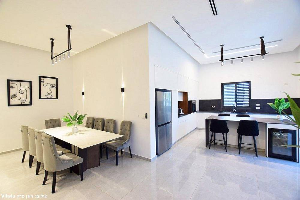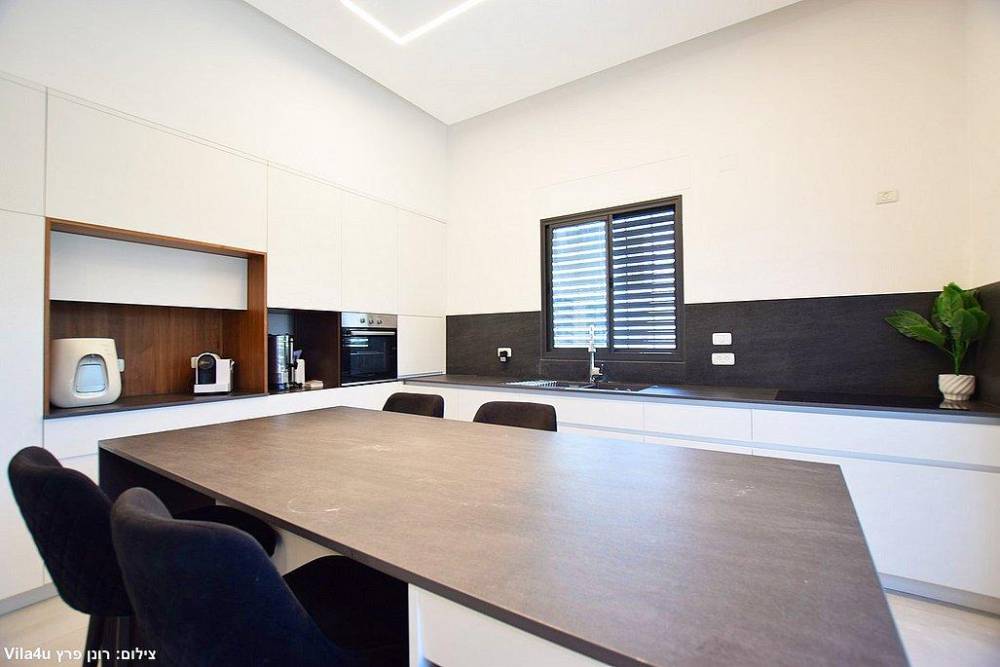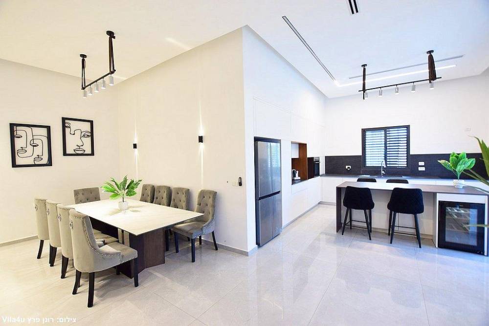 מטבח מאובזר (חברת סמל) הכולל מקרר, מדיח כלים, מיקרוגל, כיריים אינדוקציה, שיש יוקרתי (חברת דקטון), בר מים, מכונת קפה וכלי אוכל והגשה