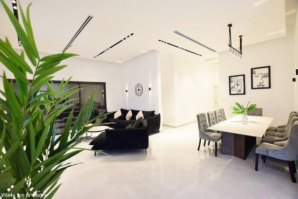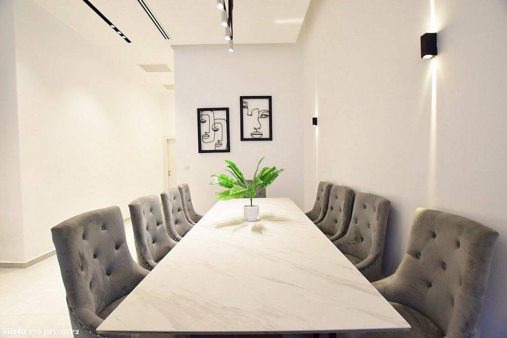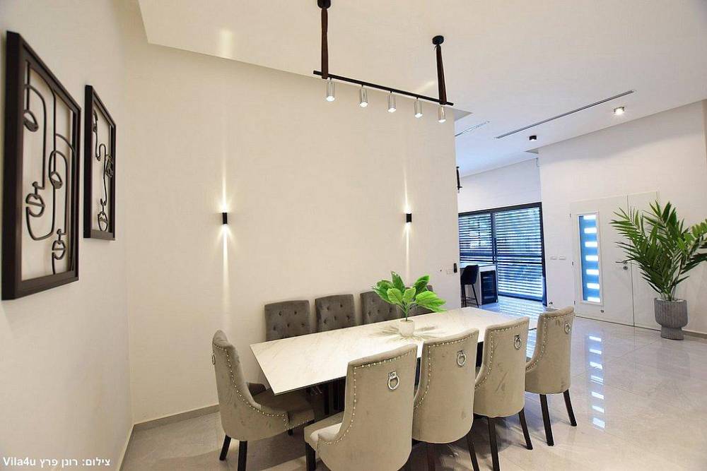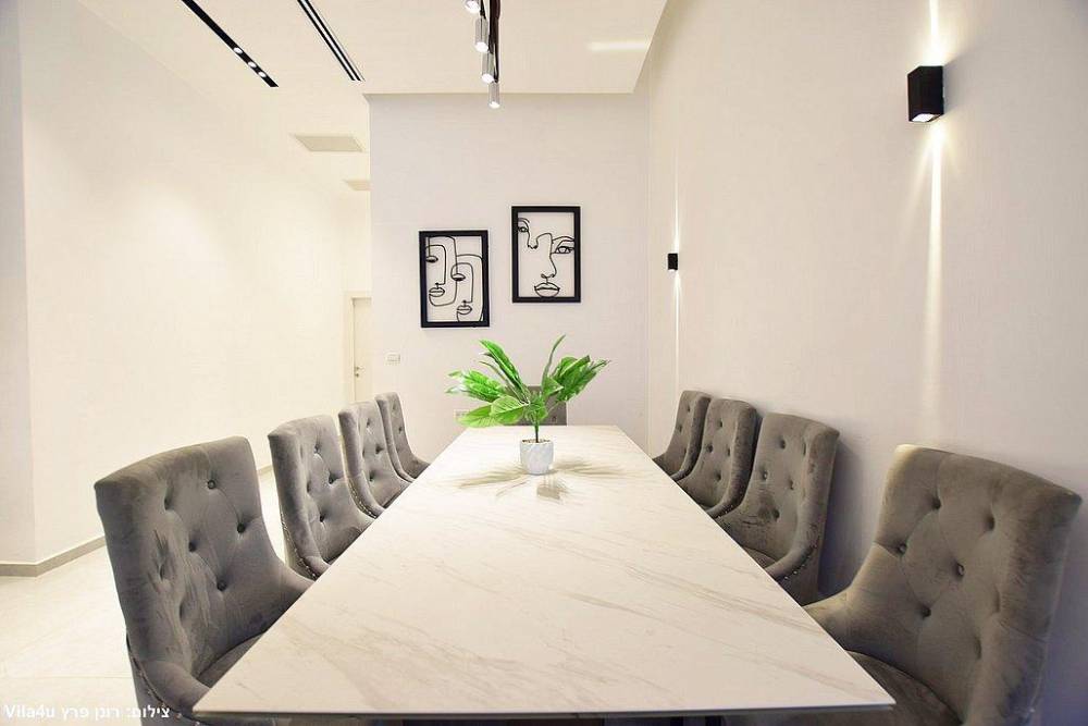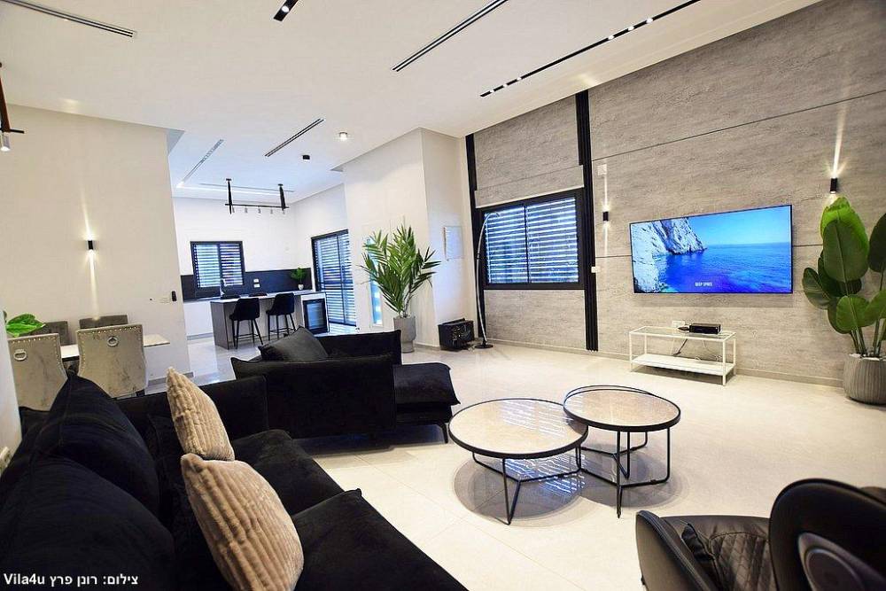 מטבח מאובזר (חברת סמל) הכולל מקרר, מדיח כלים, מיקרוגל, כיריים אינדוקציה, שיש יוקרתי (חברת דקטון), בר מים, מכונת קפה וכלי אוכל והגשה