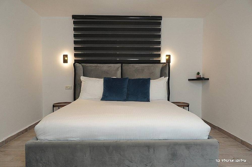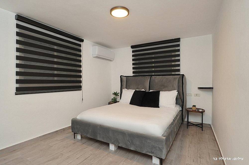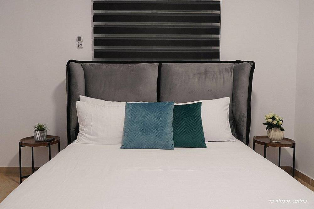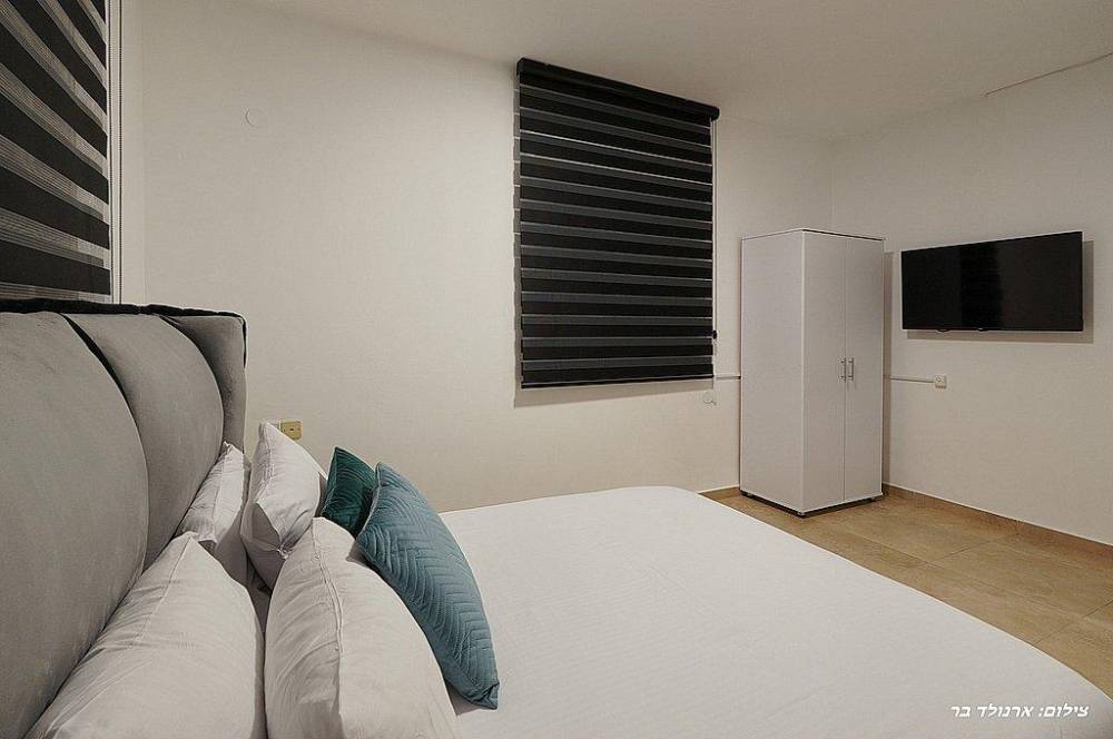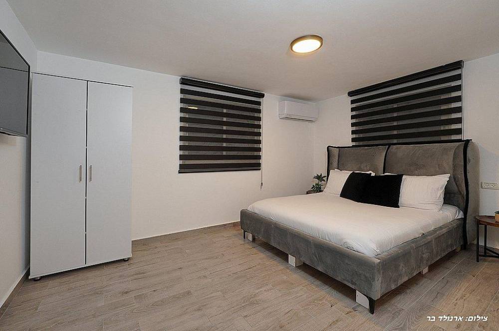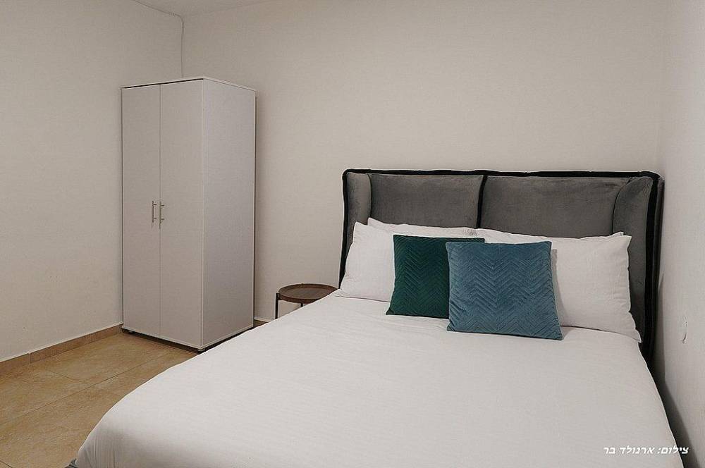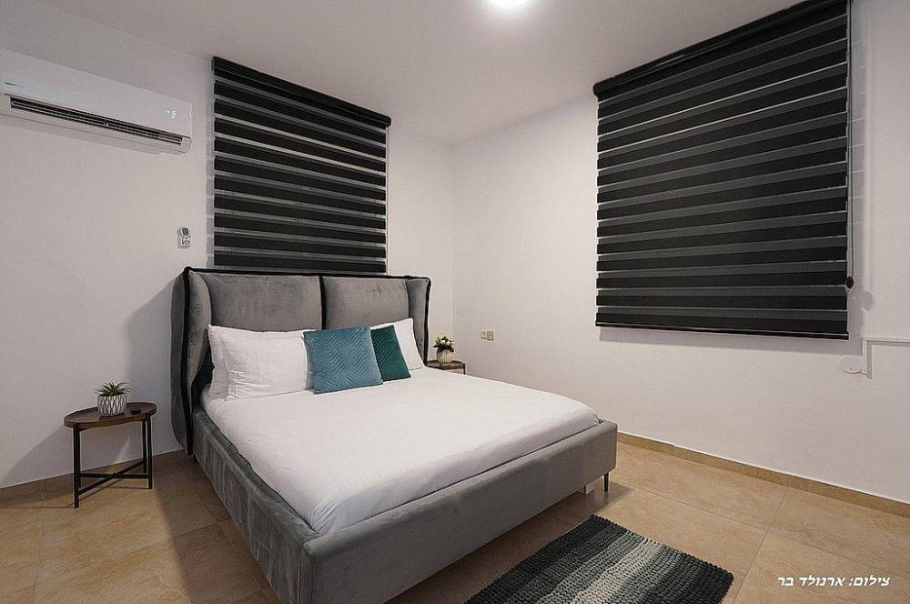 אבזור החדרים: מיטה זוגית מוצעת, מיזוג אוויר, שידות,
