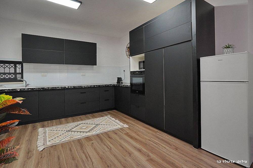 מטבח מאובזר הכולל: מקרר, מיקרוגל, תנור, קומקום חשמלי, מתקן מים , כלי אוכל והגשה, כיריים לבישול