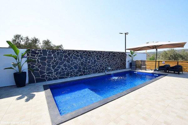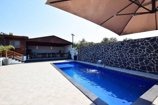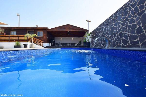 - בריכת שחיה גדולה בנויה, צלולה מרעננת עם מפל מים