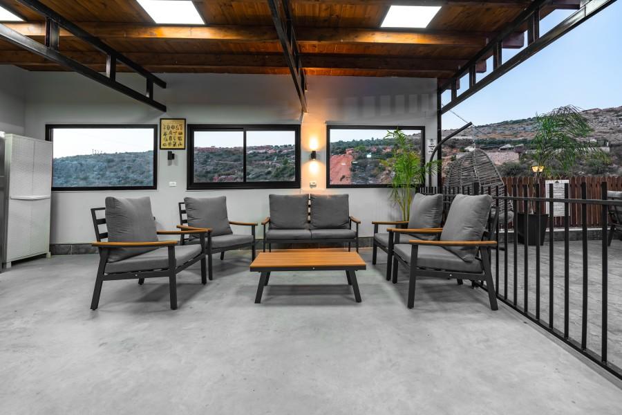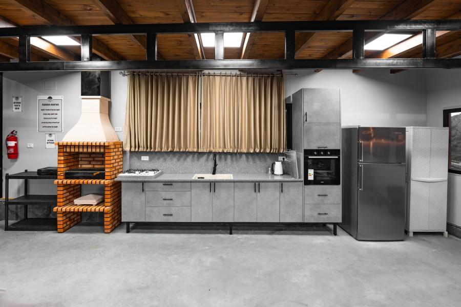 מטבח חיצוני מאובזר הכולל: מנגל פחמים, מקרר ומקפיא, כיריים גז , תנור אפיה, מיקרוגל, קומקום חשמלי , כלי אוכל והגשה