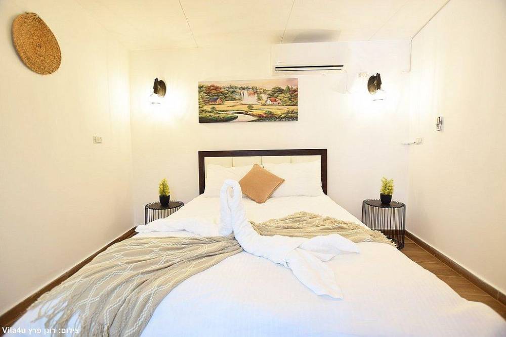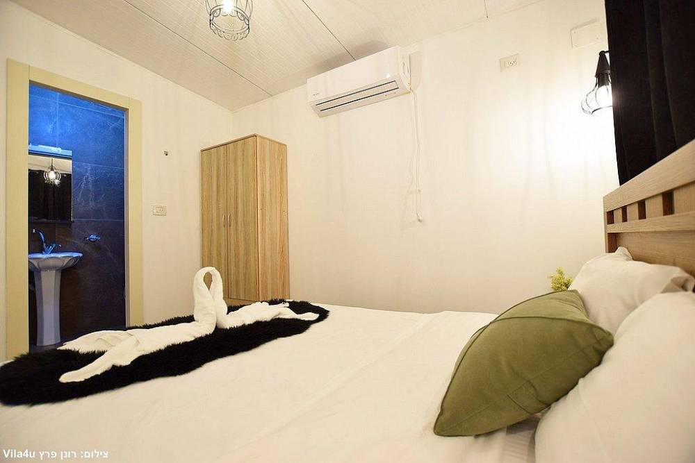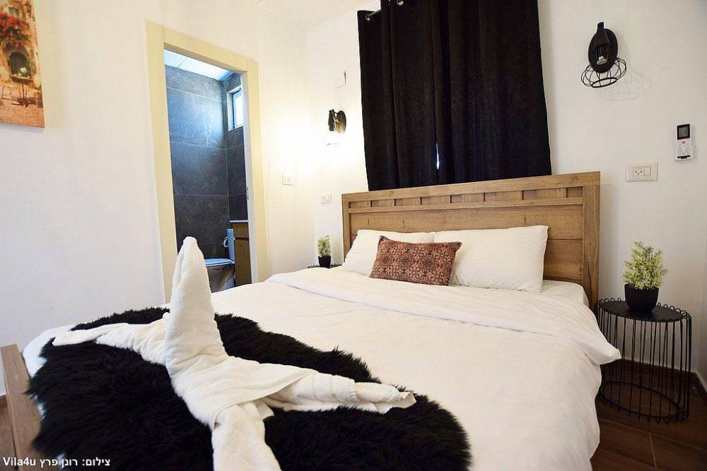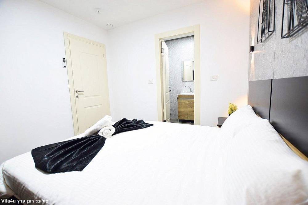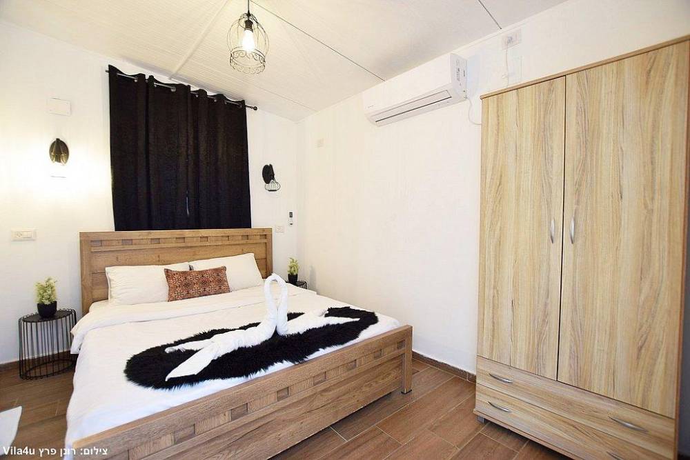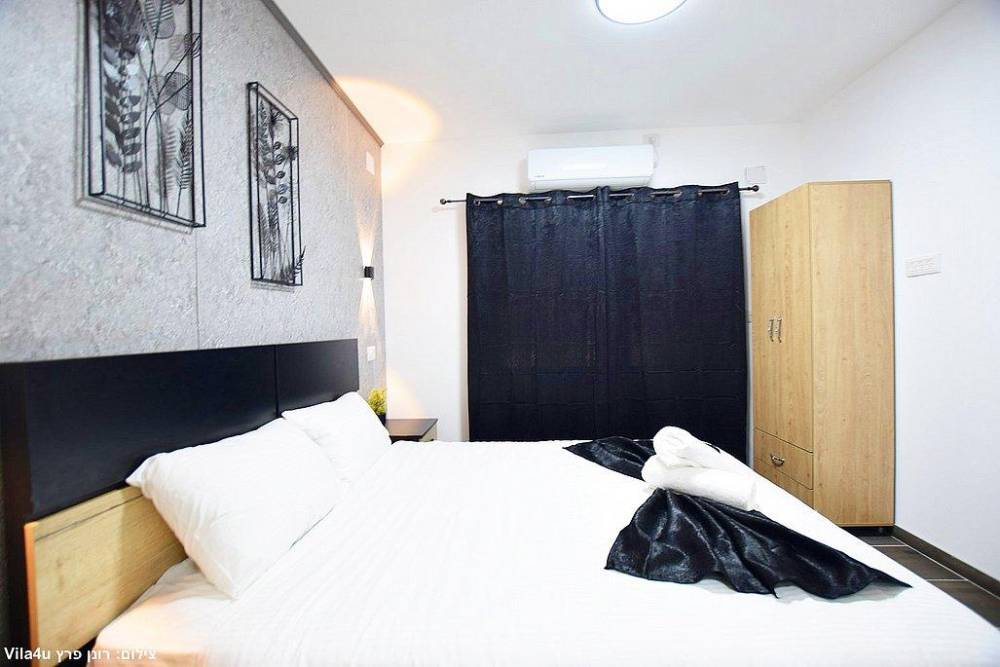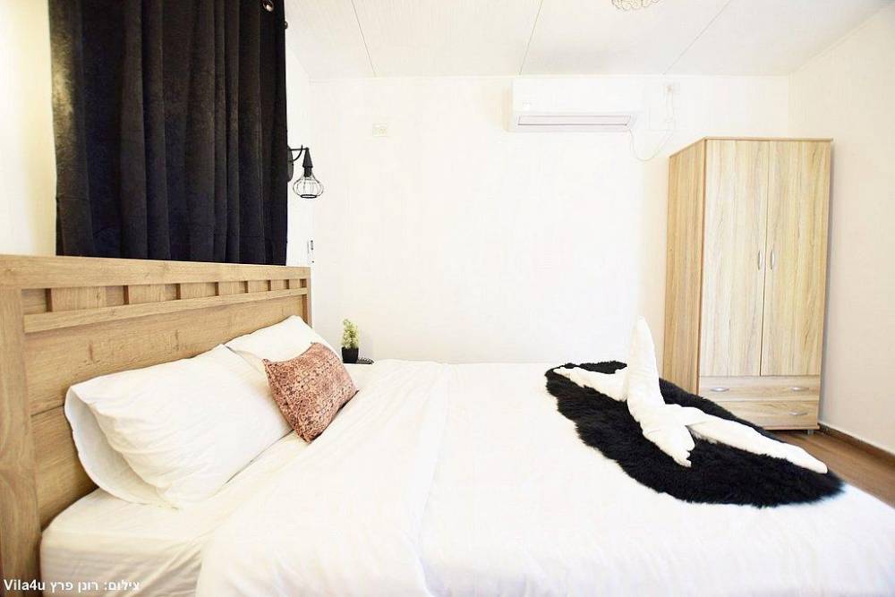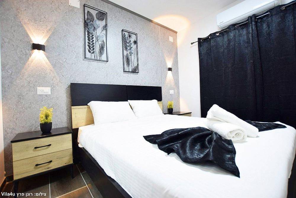 חדר שינה עם מיטה זוגית, מיזוג אוויר, שידות לאחסון, חדר רחצה