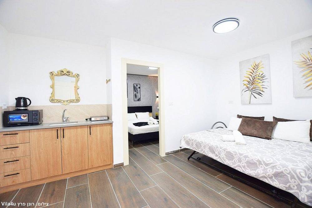 3 סוויטות- כל סוויטה מחולקת ל2 חדרים, חדר שינה עם מיטה זוגית, חדר רחצה ועוד חדר עם ספה נפתחת ומטבחון מאובזר עם פינת קפה ומקרר
