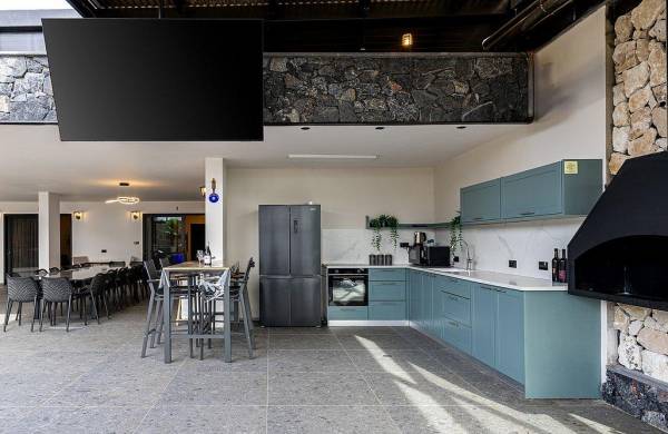 מטבח חיצוני מאובזר מכל טוב ובו: מקרר, מקפיא, תנור אפייה, כיריים גז, מיקרוגל, טוסטר, מכונת אספרסו, מתקן מים, כלי אוכל והגשה, סירים ומחבתות.