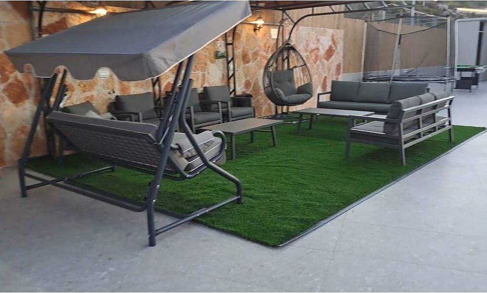 מטבחון חיצוני הכולל עמדת מנגל מסודרת, מקרר גדול, מקפיא שוכב, תמי4, מיקרוגל וכיריים גז.
